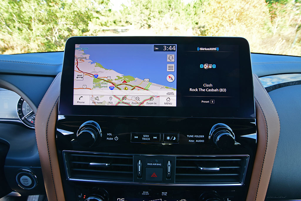 Inside, the notable changes reside with the center dashboard stack housing a new high-mounted wide touchscreen that somewhat rises out of the dashboard for better visibility and ease of reach. The new screen, a 12.3-inch unit, proves to simplify controls but my test vehicle seemed to have a minor hiccup with just a couple of functions, possibly due to the early production of the unit. The issue resided with the audio system’s tuning using the tuning knob where it froze several times when attempting to change the radio and satellite radio stations. Otherwise, the system responds well and has a slight learning curve but a welcomed redundancy of controls that use either the touchscreen or physical control knob and buttons that are mounted behind the gear shifter. Infiniti now separates the automatic three-zone climate control system from the infotainment system where it has its own interface below the air vents, which are simplistic and straightforward.