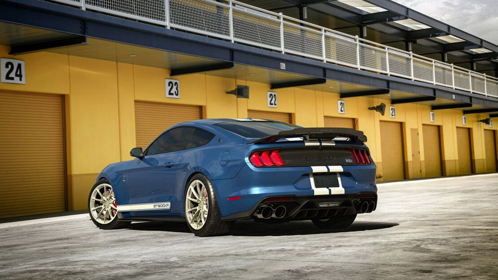 In the looks department, which serves many functionality purposes, the Shelby GT500KR gets 20-inch wheels that come polished or finished in gloss black and are fitted with extended wheel studs. There are plenty of carbon fiber bits including the hood, front splitter, rear diffuser, and Gurney flap fitted to the rear spoiler. The vents are all functional and it gets Billet caps throughout the engine bay and the proper 60th anniversary badging with Shelby rocker panel stripes, embroidered leather seats and floor mats, painted stripes, an optional rear-seat delete, and best of all, a widebody kit.