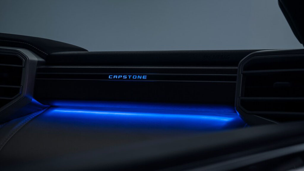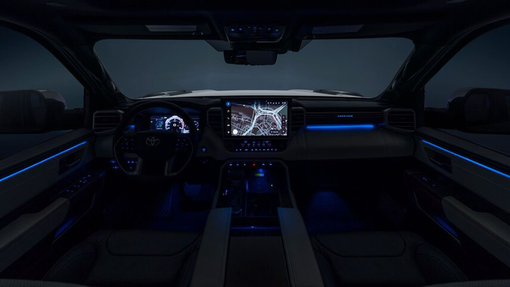 The Tundra Capstone will also be the only one to have an interior as lavish and plush as you see here. There’s semi- aniline leather seats with a distinctive two-tone color scheme, dark walnut open-pore wood trim, LED ambient lighting under the trim with a “Capstone” illuminated lettering on the passenger-side dashboard, standard panoramic moonroof, and additional work to reduce cabin noise and vibration through sound-deadening front door glass and even hydraulic cab mounts. The interior will be unique and have the proper soft-touch areas and color accents to fit the mold of a proper “luxurious truck” and potentially to compete with the likings of the Ford F-150 Limited, Chevrolet Silverado 1500 High Country (or GMC Sierra 1500 Denali), or RAM 1500 Limited.