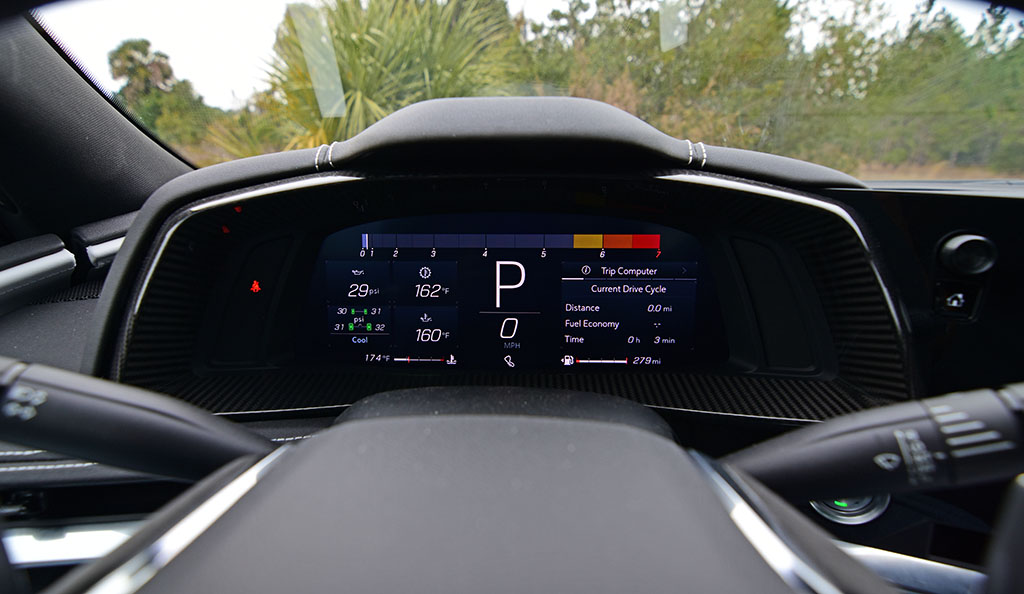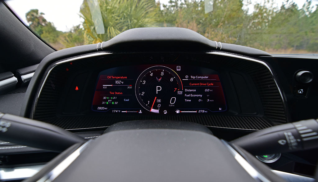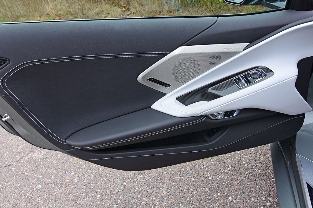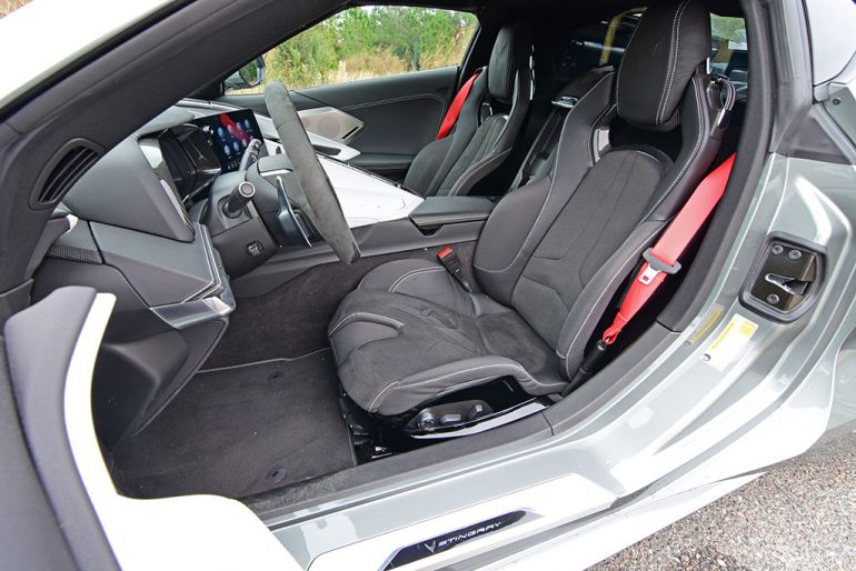 General Motors’ engineers went the extra distance to make the new Corvette C8 comfortable and adaptable, even for people like myself who are just over 6 feet tall. The unique competition sport bucket seats in my Corvette C8 test vehicle are the first of their type that I’ve experienced. In my previous reviews of the new C8 Vette, the seat choice was of a thinner seat that wasn’t nearly as padded and thick as the competition sport buckets. The comp sport buckets included ventilation, heating, and 8-way power adjustments along with 4-way lumbar support and proved to be quite comfy and body-conforming on longer drives. Otherwise, the seats did take up more space and felt a little higher, maybe leaving the driver and passenger about an inch less usable area than the other 8-way power GT and GT2 bucket seats found in my older C8 test vehicles.