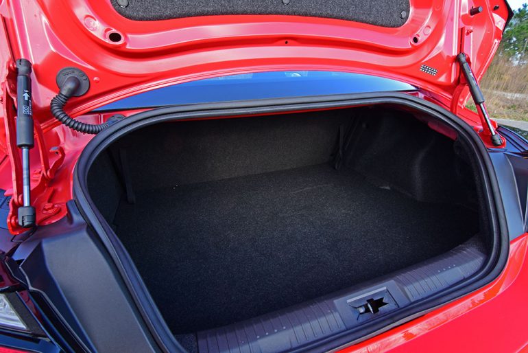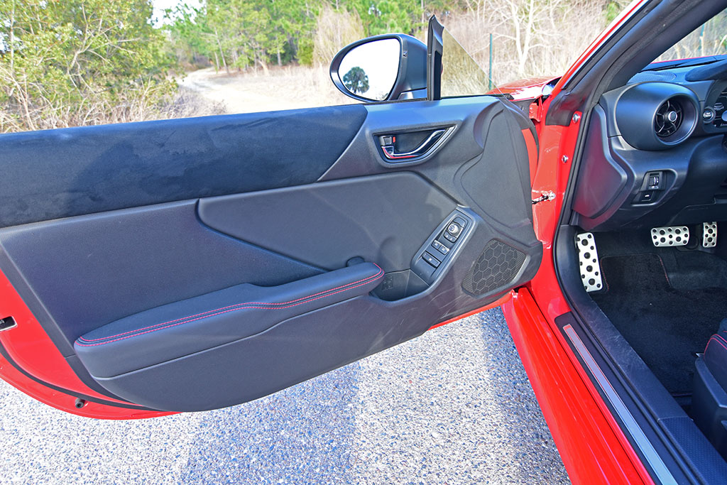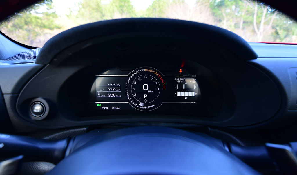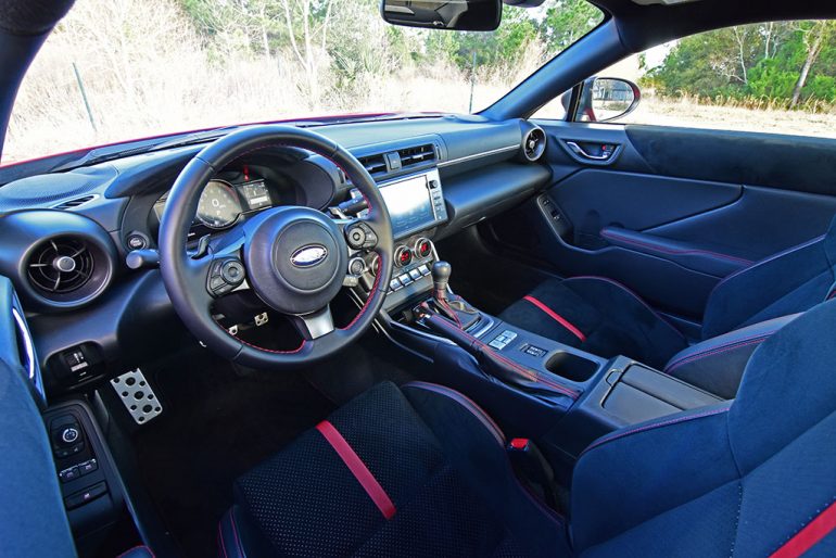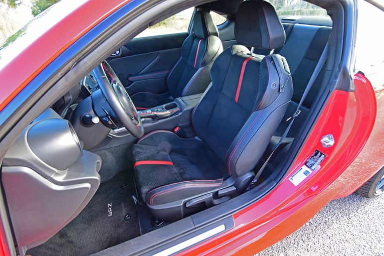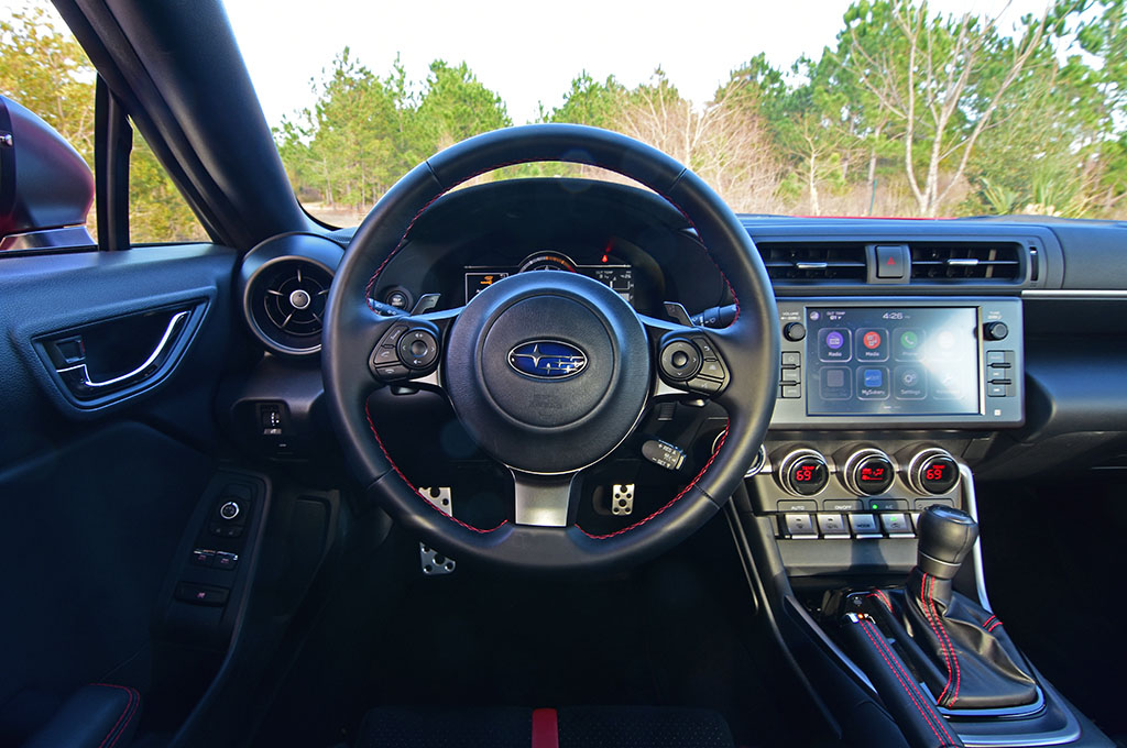Inside, the new Subaru BRZ is restyled for the redesigned model year featuring a simpler layout of the dashboard and controls. There’s a new 7-inch digital instrument cluster that changes its configuration with the track drive mode. The latest Subaru Starlink infotainment system is more simplistic and features Apple CarPlay and Android Auto integration fed through an 8-inch touchscreen that sits just above the dual-zone automatic climate controls. The audio system still sounds like it’s a pair of cheap bass-lacking speakers being echoed through a tin can. Also, I’m not a fan of the smallish steering wheel buttons to control the audio, phone features, and digital instrument cluster.