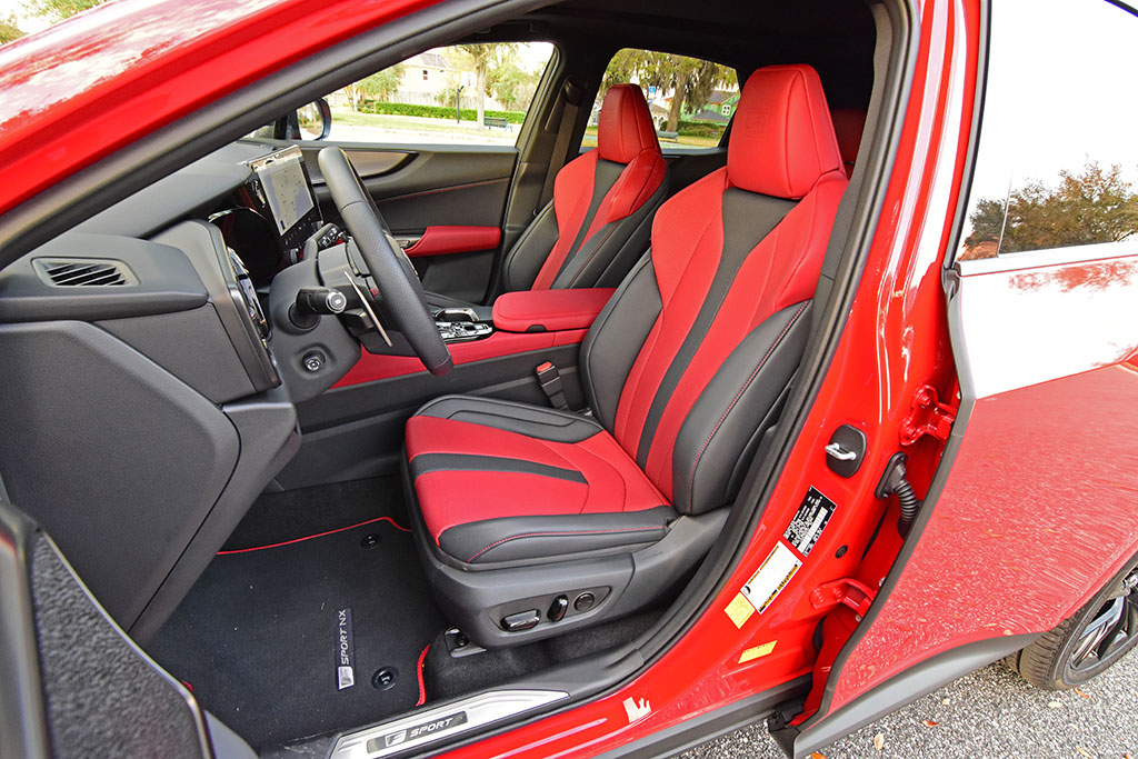 The 2022 Lexus NX retains a bold design but takes it up a level for a classier feel and look and an option to make things somewhat sportier in the NX 350 F Sport trim of my test vehicle. Adorned in an eye-popping Redline exterior paint, my new Lexus NX 350 F Sport has stunning looks with the darkened 20-inch wheels that fill the wheel wells and the proper black accents and black spindle grille that all fit the Lexus theme of sporty luxury. There’s an updated look but most of what was liked about the first-generation NX is carried over in subtle ways but bolstered by futuristic-looking updates like the new LED taillights with a taillight bar that runs the width of the rear accented by new brand letters “LEXUS” spelled out instead of the old traditional “L” badge. The “LEXUS” letter badging across the rear is a change that will be across the full lineup of Lexus vehicles soon. The front is still clearly recognizable as a Lexus and there’s new updated LED headlight housings with cornering lamps and auto high-beams that flow into the large spindle grille and accented lower chin spoiler for the F Sport trim.