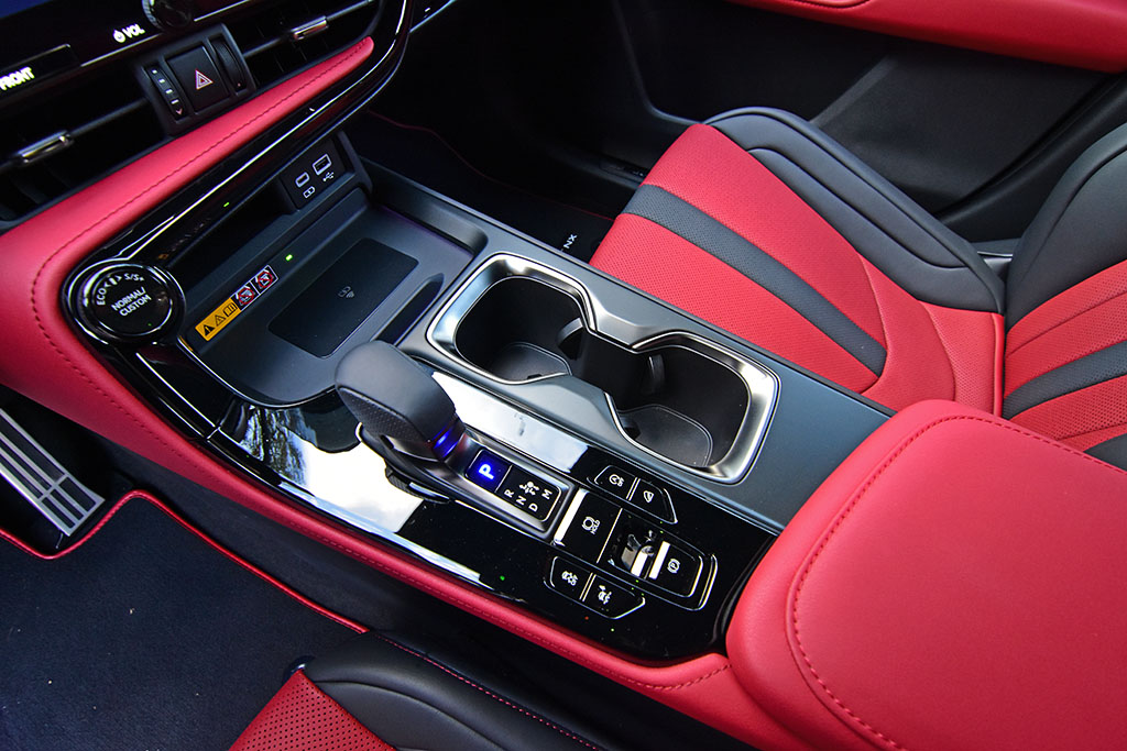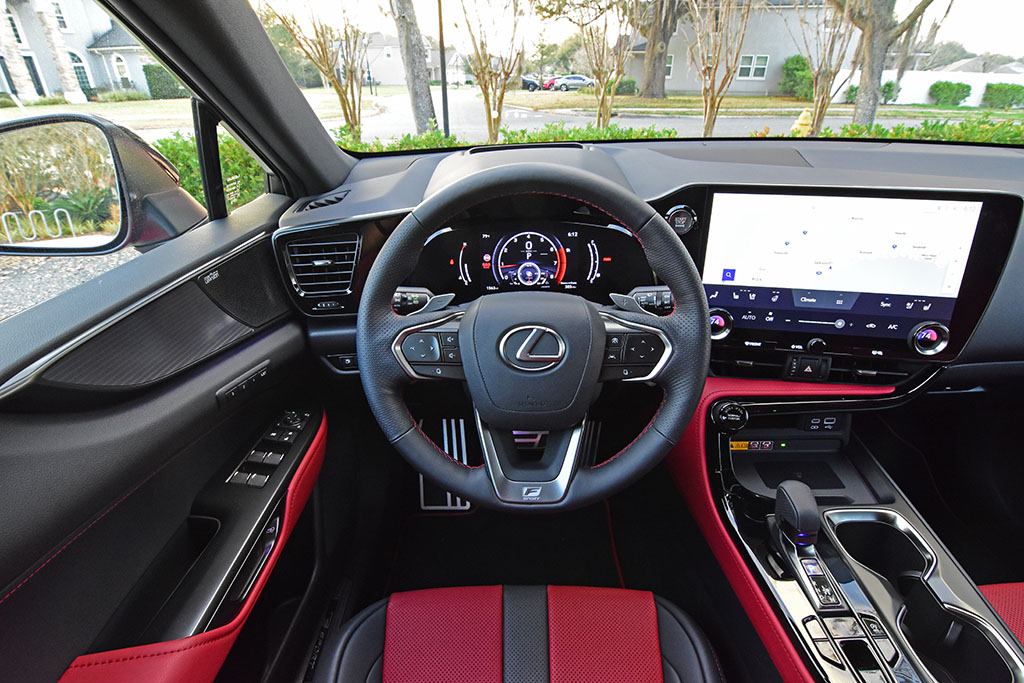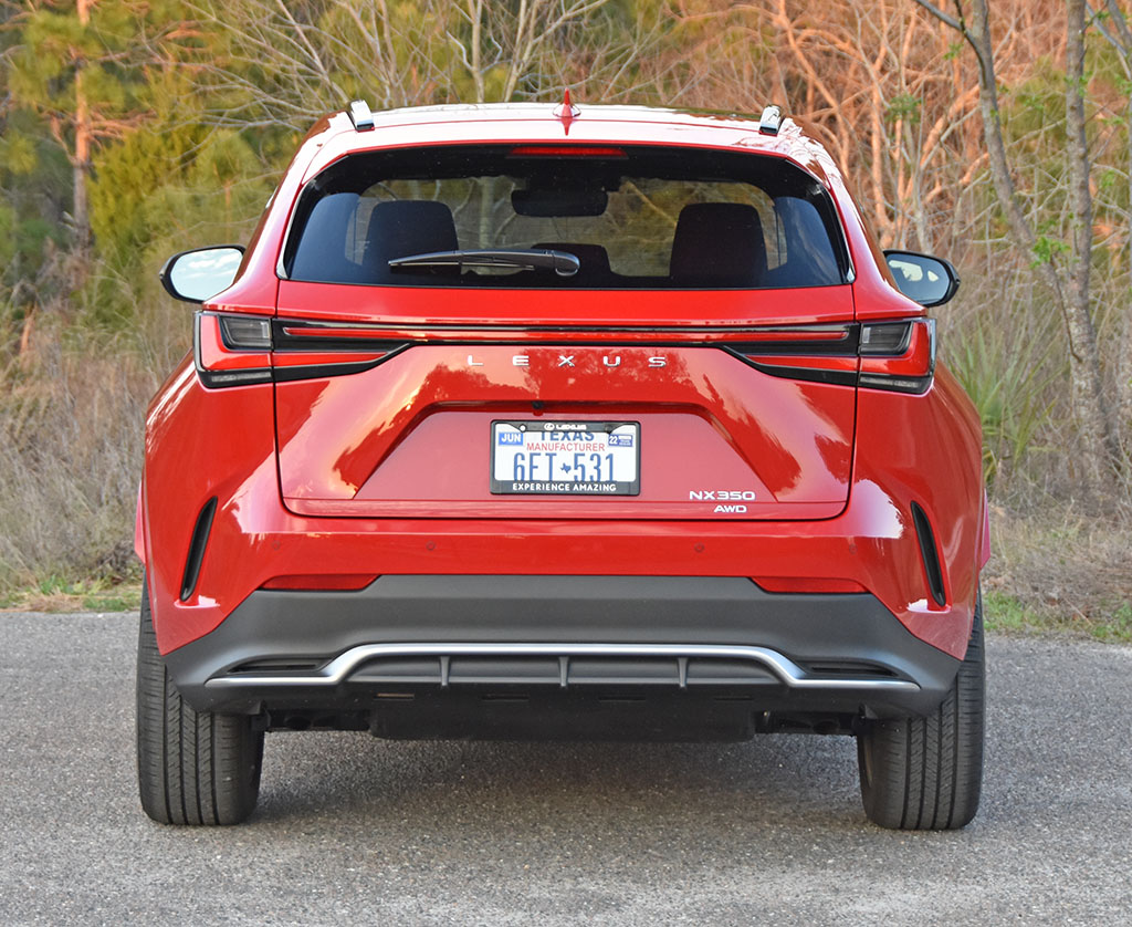 Not only did Lexus captivate with the exterior of the new NX but under the aluminum hood, there’s a new engine for the NX 350, a 2.4-liter turbocharged 4-cylinder good for 275 horsepower and 317 lb-ft of torque. The engine is paired with an 8-speed automatic transmission that shifts smoothly and just quick enough to keep you somewhat entertained when you’re pushing the NX. Getting into the throttle the NX 350 F Sport moves along well and hits 60 mph from a stop in about 6.6 seconds and there’s a welcomed solid feel to the way the NX 350 handles but seems to be not as lively or spirited as BMW crossovers. Overall, the suspension is nicely tuned with adaptive dampers that only subtly firm up in the Sport S+ drive mode or configurable damper Sport setting in the Custom drive mode. The braking feel is assured and the sound from the 4-cylinder turbocharged engine when it spins near its redline is somewhat subdued through clever sound deadening. There’s also a very solid feel for the chassis of the NX 350 but nothing about the NX departs from what is expected out of a Lexus where much is kept in check and never overdone. On occasion, the NX 350 F Sport rides like a much larger SUV possibly due to the adaptive dampers attempting to smooth things out coupled with the large 20-inch wheels.