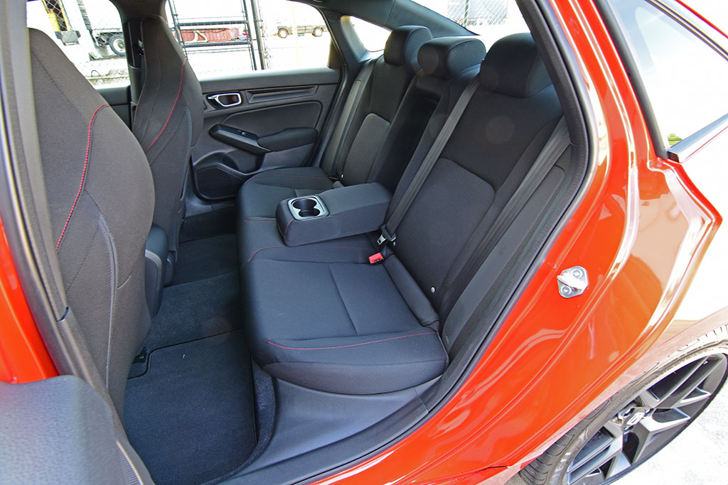 The soft-touch upper dashboard encapsulates a unique mesh that runs through the front climate vents with a nice modern touch to the vent control knobs. The seating area up front has plentiful space while the cloth seats are nicely bolstered but have manual adjustments only with no heating for the Civic Si available. Overall, there’s a new perception of a premium interior in the redesigned Civic, and the Si adds a bit of flair to that new style with its red-colored accents throughout. Trunk space is decent at 14.4 cubic feet.