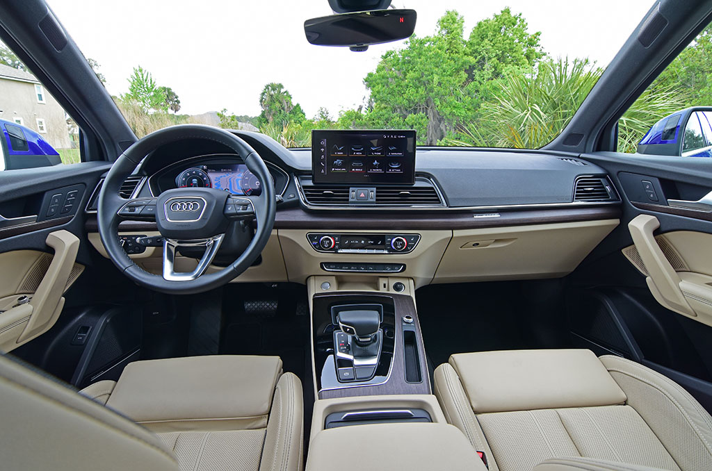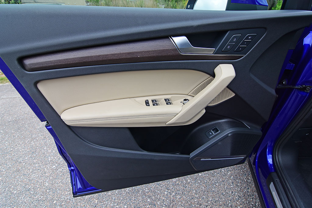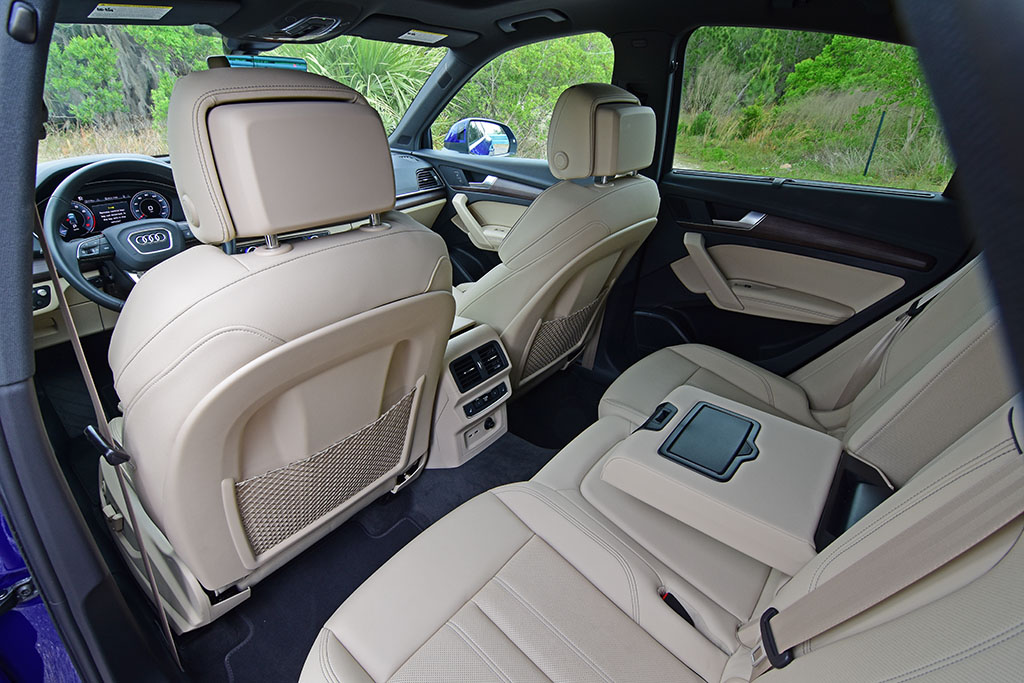 The seating arrangements have a surprising amount of space with the Q5 Sportback being a compact crossover and having some of its rear headroom and cargo space cut short from the impeding roofline. The front heated and ventilated seats have good lateral support and plentiful forward and aft adjustment. The heated rear outboard seats have just enough room for two adults and one child in the middle of the bench.