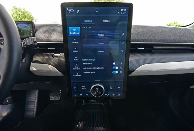 Inside there are of plenty soft-touch surfaces, including the bulk of the upper door trim. On the dashboard. there is an interesting use of fabric covering some speaker areas of the 10-speaker Bang & Olufsen audio system. Oddly, the climate vents are somewhat hindered by the massive portrait-oriented 15.5-inch infotainment screen, which is unique in its own right and feels more natural than other screens oriented in such a manner. The screen combines all the vehicle functions and controls but is nicely integrated for quick ease of use once you overcome just a short learning curve. The system, utilizing Ford’s new Sync 4A setup, displays the important functions in a fixed area but allows the best use of such screen real estate that I’ve seen in a modern vehicle. For starters, the 360-degree camera system expands and makes clever use of the screen real estate, in addition to Apple CarPlay and Android Auto displayed in a larger form than most with the option to shrink its display area. The vehicle functions and settings are grouped together within a quick access Mustang Mach-E icon at the top left, and the volume knob is nicely integrated to float at the bottom of the screen for easy reach. Ford thought this through!