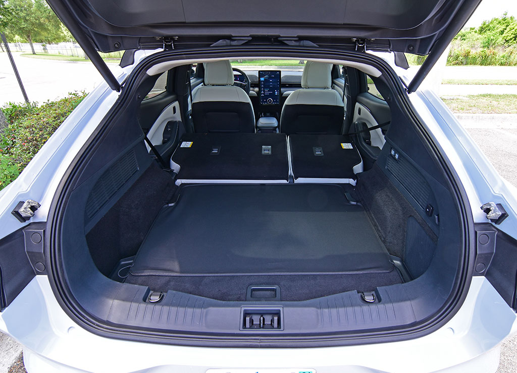 The back seats have a surprisingly good amount of space, and the cargo capacity is good at just under 30 cubic feet with the 60/40-split seatbacks in place. Fold them down and you get just over 59 cubic feet of space, all accessed through a hands-free power liftgate. As a bonus, which is expected from EVs, is a 5-cubic-feet frunk (front trunk) area with plastic storage dividers that also allows you to use it as a cooler to store ice and easily drain the water from the compartment after the ice has melted.