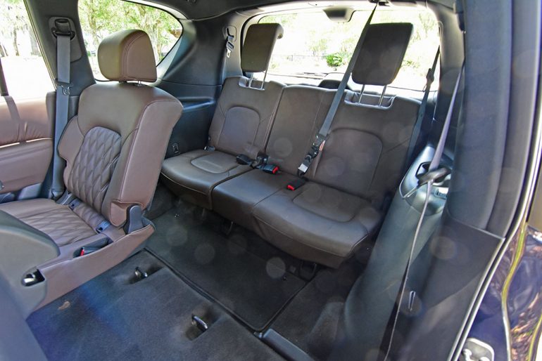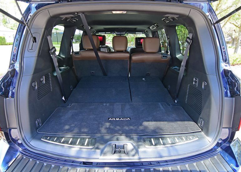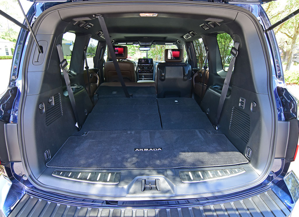 The seating space of the Armada is plentiful, but the driver’s seat doesn’t have as much travel as I would have hoped, which has been my primary complaint of the Armada and QX80 over the many years of this current generation. The benefit of the Armada is the seating for eight having a second-row bench seat. Getting into the third row remains to be an act of the second-row seats tumbling forward making way for a usable area for three passengers with decent headroom. The cargo space behind the third row is smaller than many competitors but folding down the 60/40 split seat backs opens the area nicely using the power-fold buttons.