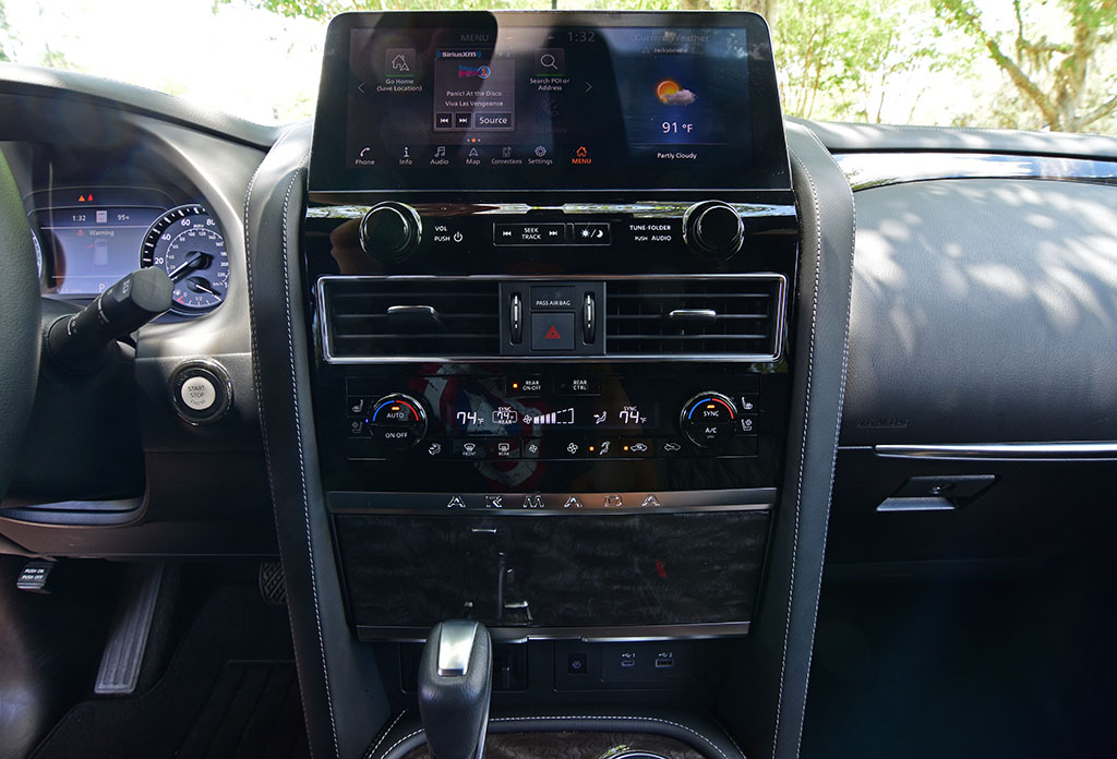 Inside of the Nissan Armada is a familiar cabin that’s only been updated with the center stack now having a welcomed 12.3-inch touchscreen that is the only screen for the infotainment system and a variety of vehicle controls and settings. The updated system has some minor faults with the response of inputs where it may take a second or two to register. Overall, the system is a nice change from the previous two-screen setup and is mounted in the proper position for easy reach and to lessen distractions from the road. There’s wireless Apple CarPlay and Android Auto integration, which can also be paired through USB. There’s a neat wireless smartphone charging pad tray with its own cubby door.