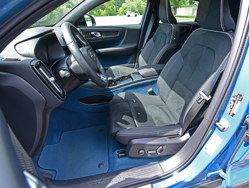The ride quality is on the firm side and some of the curb weight of the C40, around 4,800 pounds, can be felt at times when you’re not laying into the accelerator pedal. The C40 feels securely planted to the road without any drama when pushing it a little hard through turns thanks to the low center of gravity with the battery back being under a floor that’s surprisingly not flat inside. There’s a nice solid feel to the C40 Recharge out on the road that inspires driver confidence and the instant 486 lb-ft of instant torque feels like you can overtake almost anything and all you hear on the highway is a slight roar from the large 20-inch Pirelli Scorpion All-Season tires.