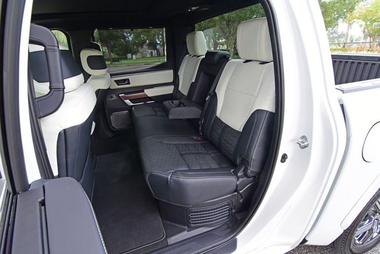 There’s plentiful space in the cabin where the rear seat is almost like a large sofa. Toyota retains its unique full roll-down power rear window. Under the rear seats, there isn’t any additional storage as the area is taken up by the hybrid battery pack in the Tundra Capstone trim.
