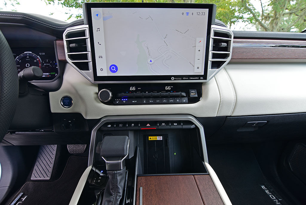 The new infotainment unit in the Tundra, which is normally standard with an 8-inch touchscreen, is a new 14-inch unit in the Capstone trim that brings us the latest Toyota Audio Multimedia system that uses the voice prompt integration that allows the wake word “Hey Toyota” to prompt voice input functions. The system is rather simplistic in its initial design where the large screen real estate is oddly used for just one feature at a time instead of allowing a split screen. Some may like the simple approach and the connectivity of the system feeding its navigation from a cloud-based service that requires the setup of a user profile to truly customize the full array of features and options. The system proves to be responsive and has a short learning curve all with the integration of wireless or USB-connected Apple CarPlay and Android Auto. The wireless phone charger is nicely integrated below the array of physical controls for the automatic dual-zone climate system and several vehicle function toggles.
