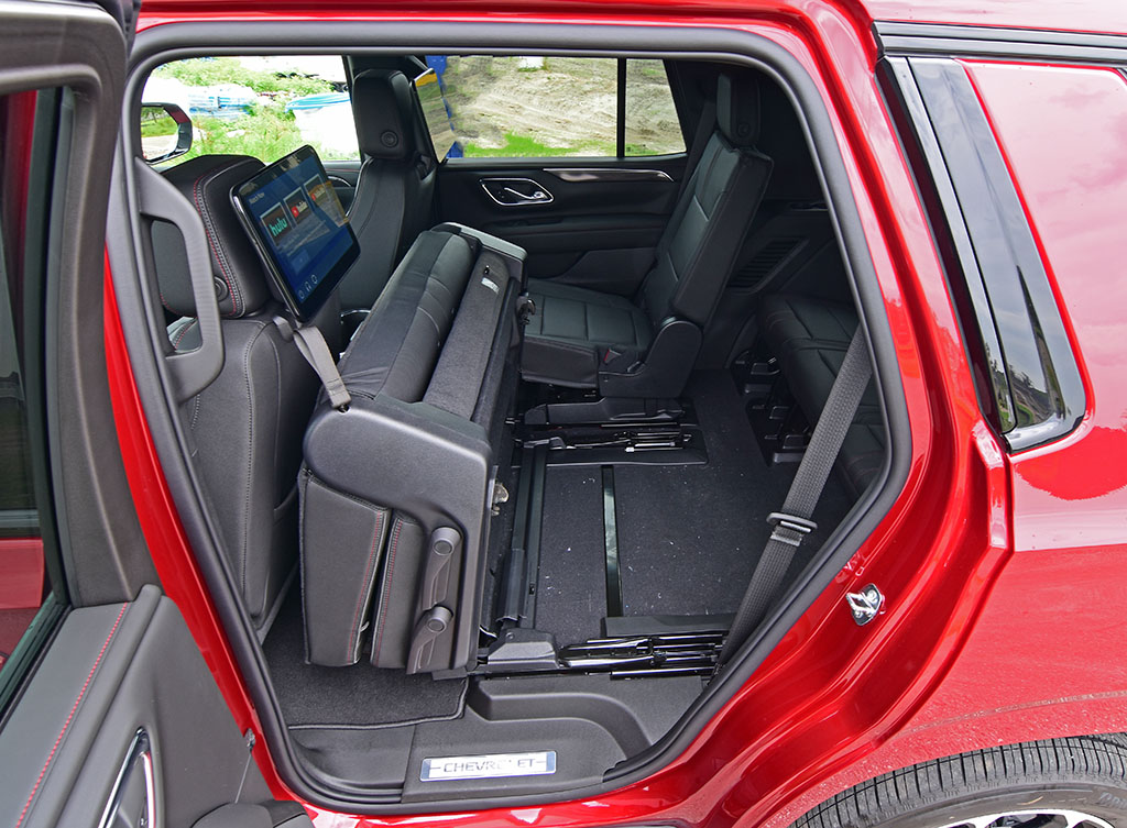 From the recent redesign for the 2021 model year, the Chevrolet Tahoe has a more inviting cabin with easy access to any row of seats. There’s somewhat of a downplay on content for the Tahoe RST trim, which helps to keep the cost down. However, there are still the expected creature comforts of front heated seats, 3-zone automatic climate control, a wide range of adjustability in the front power-adjusted seats, the availability of a rear seat media system optioned on my test vehicle with dual 12.6-inch touchscreens mounted behind the front seats, and the integration of wireless Apple CarPlay and Android Auto fed through the latest 10.2-inch touchscreen infotainment unit. There’s a wireless charging pad that gets the customary under-pad cooling you expect in new GM vehicles to help keep your smartphone from overheating during charging.