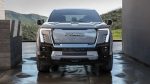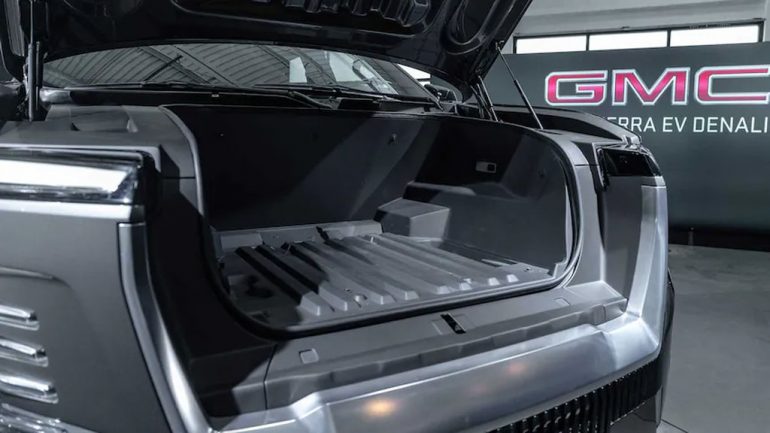 Other highlighted design cues are found up front with the low-mounted LED headlights positioned in such a place on purpose to help reduce glare for oncoming vehicles at night. There are also huge 24-inch wheels on the Denali Edition 1 trim. Under that unique grille-less front end is a huge frunk that power-opens/closes with a 120-volt outlet and two drains.