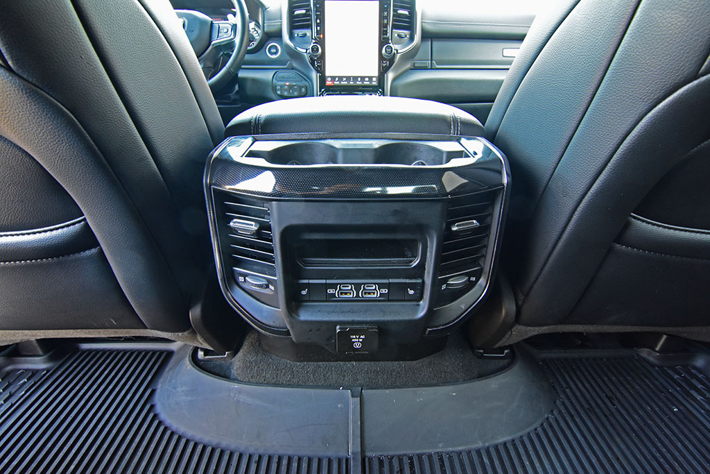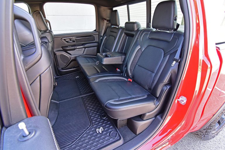 Seating space is plentiful in the Ram 1500 Rebel, which only comes as a Crew Cab setup. There are also a decent amount of storage areas with easy-accessed bins under the rear floor. However, the choice to locate an upright trigger gear shifter in a traditional floor console space may be a bit controversial for some as it takes up some of the usable console space that some enjoyed when there was a rotary dash-mounted shifter.