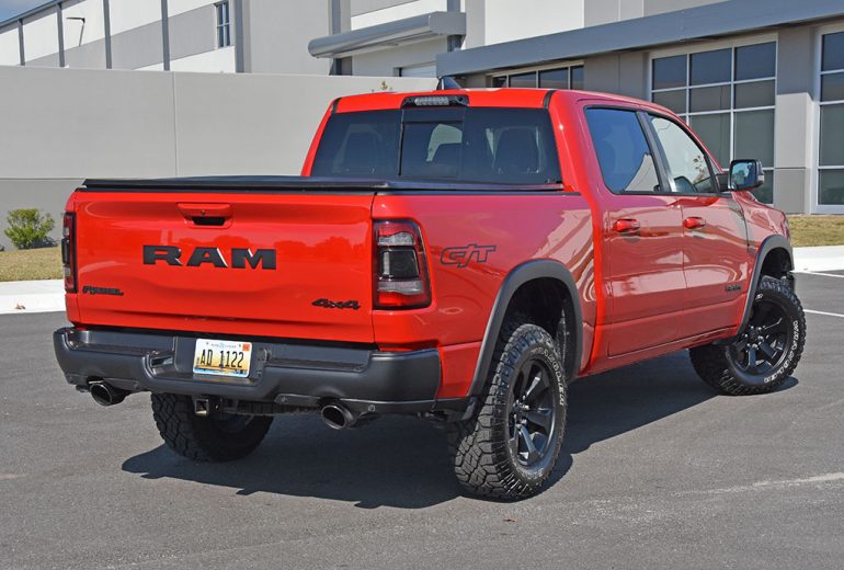 The Ram 1500 Rebel G/T moves along at a good pace out on the road where there’s a delightful rumbling note from the sport exhaust system out back accentuating the smooth power of the HEMI V8. There’s also a Mopar cold air intake system added to let the HEMI V8 breathe a bit better as part of the G/T package. Getting up to 60 mph from a standstill requires about 6.4 seconds, which isn’t bad for a full-size truck. The latest Ram 1500 Rebel G/T is closely matched with vehicles like the new Chevrolet Silverado ZR2 that we reviewed a couple of months ago.