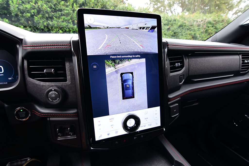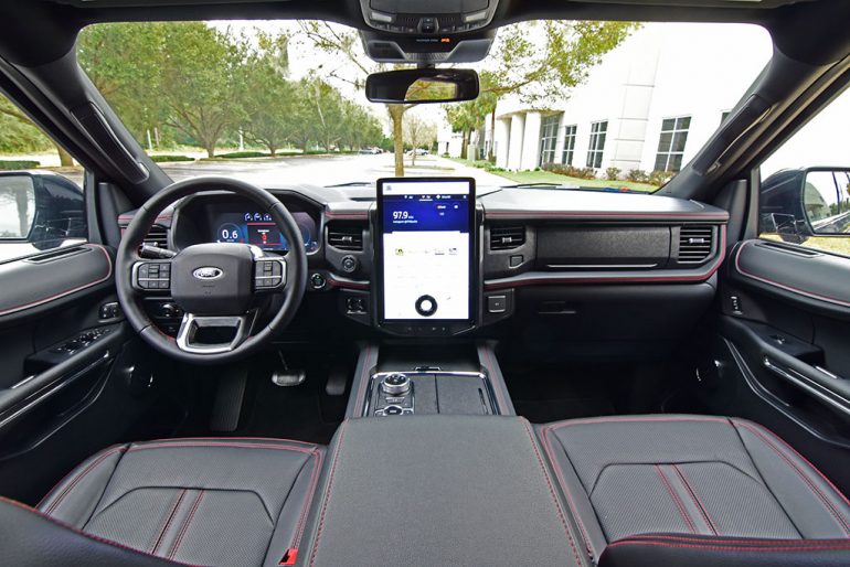 Ford brings the expected active safety features bundled in the Ford Co-Pilot 360 suite (blind-spot monitors, lane-keeping system, automatic emergency braking/forward collision warning, cross-traffic alert) to the Expedition but goes one step further to also add in the handsfree semi-automated BlueCruise system to the Expedition Platinum trim. There’s also the welcomed 360-degree surround-view camera system that’s nicely laid out in the large 15-inch screen with both top-down and rearward views (switchable).