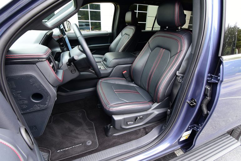 The interior of the new Ford Expedition is spacious as you would expect and there’s never the need for additional space even when you’re over 6 feet tall and you must sit in the second or third row of seats. As a 7-passenger setup in my nicely equipped Expedition Limited Stealth Performance test vehicle, there’s a welcomed sporty theme throughout where all seats have accented red stitching along with matching soft-touch and stitched dashboard and door trim surfaces.
