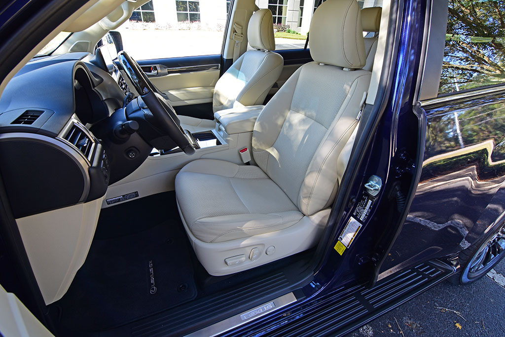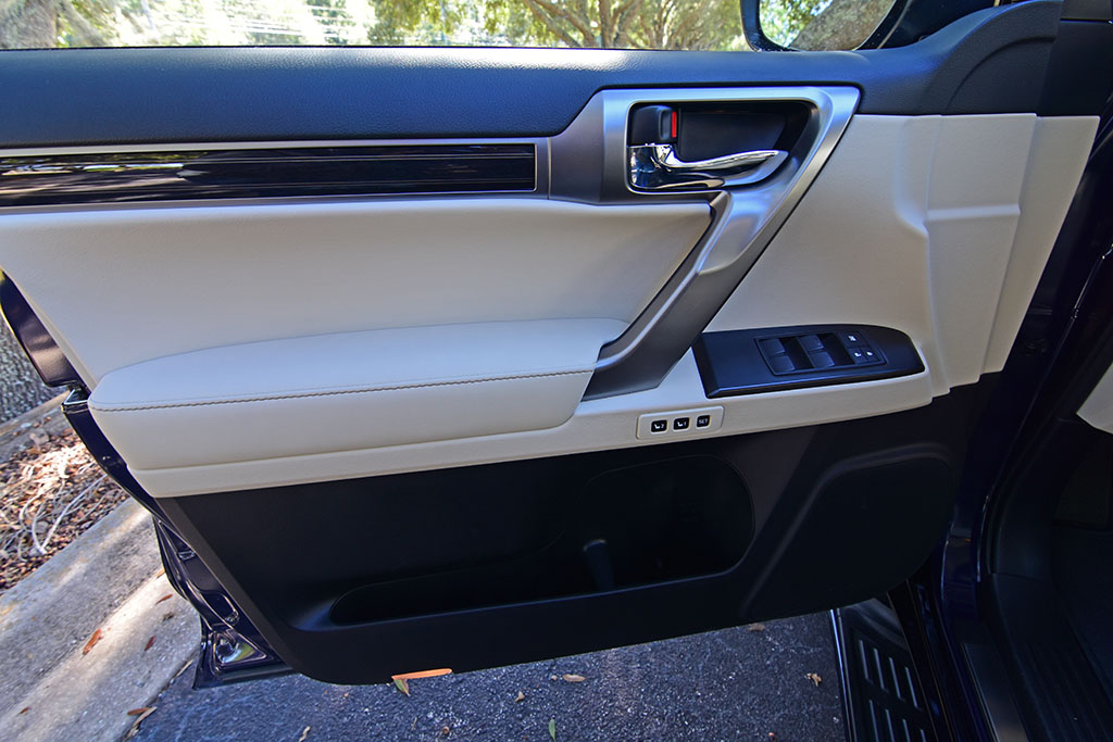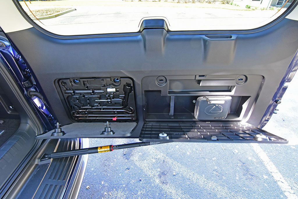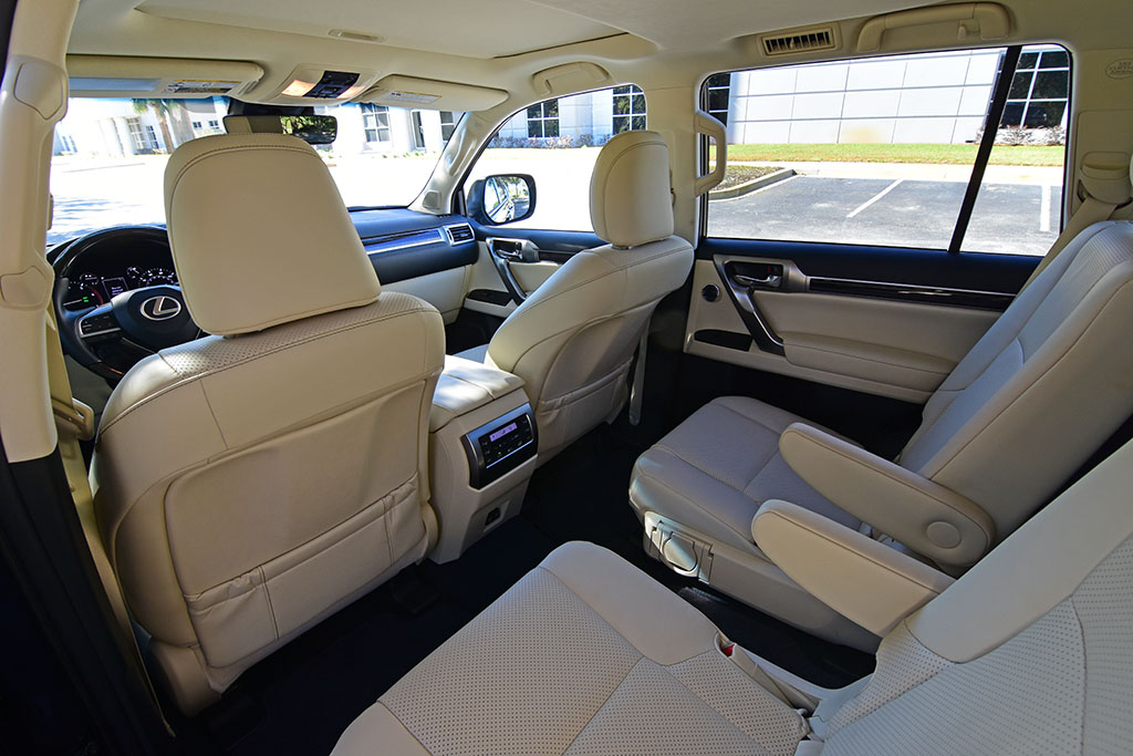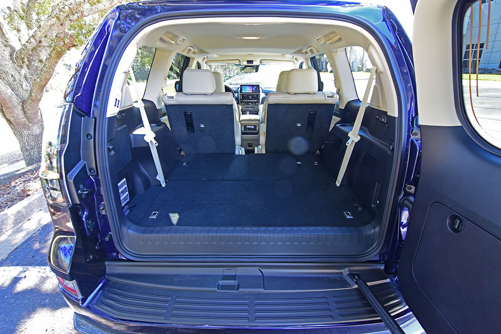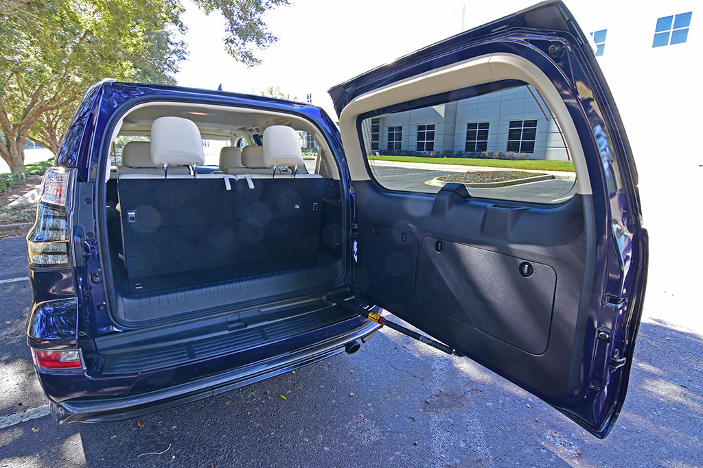 The high seating positions and proportions may be considered a little narrow in some areas but continue to accommodate with the versatility of seating positions. Cargo space is very short with the three rows of seats in place but opens up nicely when you power-fold the two-passenger third row. Accessing the cargo area is still done in a rather unique and odd way with the swinging rear hatch door, which requires that you have ample space behind the GX to open. Somewhat mitigating the wide swing to access the rear is still done by lifting the glass window of the hatch.