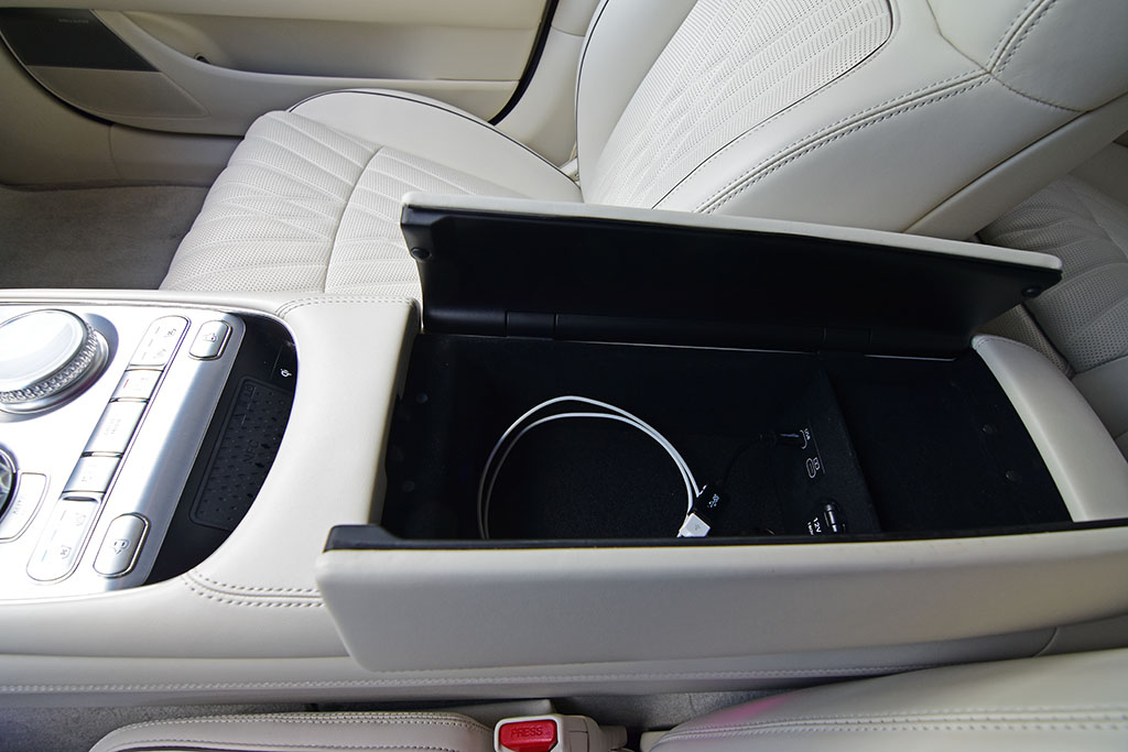 Genesis took a few pages out of the luxury sedan playbook and gave the G90 power-closing doors that magically close at the push of a center console button, pressing the door popper button, or pressing the keyless entry indentation on the power-retractable exterior door handles. Not only are onlookers or curious passengers going to be amazed at the power-closing doors, but they will smell one of the various interior scents that can be set to ventilate through the cabin, which may overshadow the natural nappa leather smell. Just about every surface is a premium material along with the proper soft-touch surfaces throughout, leaving no room for even the smallest bit of cheap hard plastics. The color-selectable ambient LED lighting can be set to stand out in a bright setting where you will find it in several areas illuminating the unique wood trim inlays or even lighting up the edges of the power sunshades of the two sunroofs.