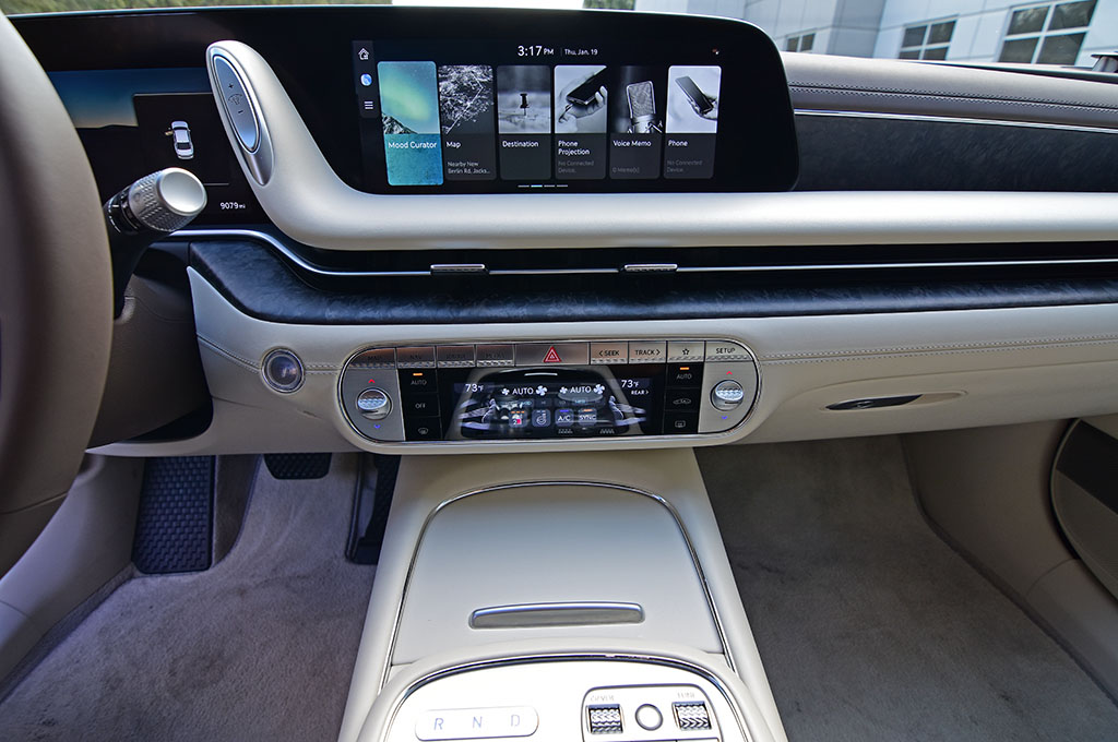 The dashboard features a slightly new design for Genesis with two 12.3-inch screens where one serves as the digital gauge cluster, and the other brings a return of the infotainment touchscreen system from the brand. The infotainment system is the same that’s found in current Genesis vehicles that can also be controlled by a central controller wheel. The system has a plethora of core menus, which may make it somewhat intimidating at first, but once you spend a few hours with the system, it then becomes second nature to control, both with the touchscreen and physical control knob. The four-zone automatic climate control system has its own color touchscreen below with a set of physical buttons and toggles for the temperature. The rear seats have their own large color touchscreen if you fold down the center seatback – for various controls from the audio system to seating controls.