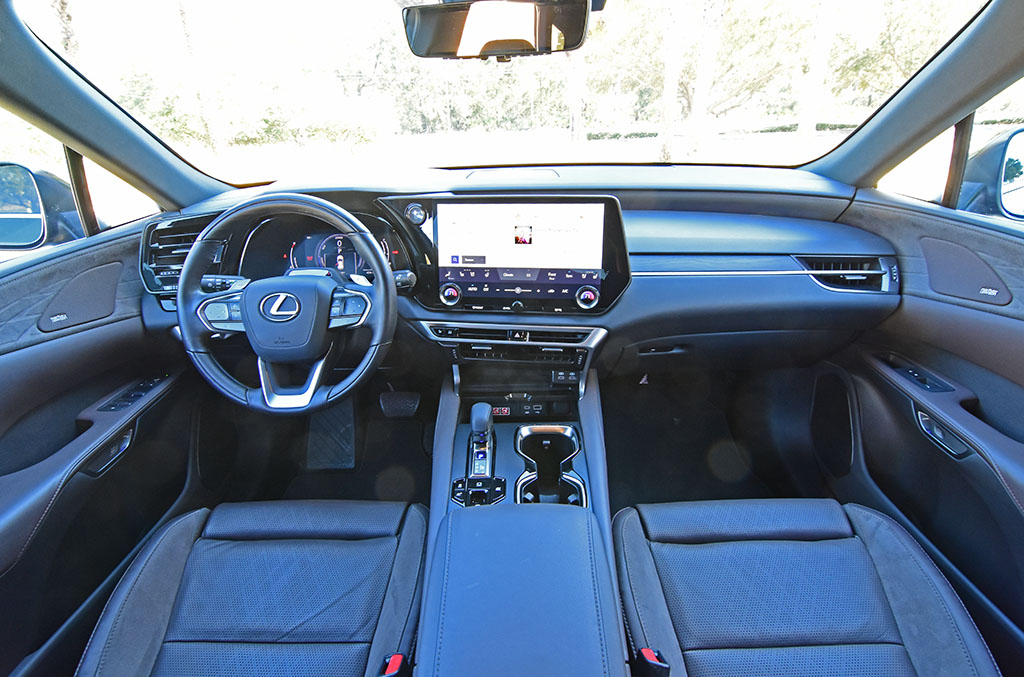 Inside the new Lexus RX, there’s a slight reworking of the proportions that feels mostly like a larger Lexus NX. The seating areas have plentiful room, and the semi-aniline leather-trimmed heated and ventilated front seats are comfortable and feel up to the task of preventing fatigue on long trips with several power adjustments, including 4-way lumbar and a power thigh adjustment. In the rear, featuring heating and ventilation for the outboard seats, there’s a good amount of space and the convenience of controls for the third automatic climate zone, along with manual side window sunshades.