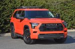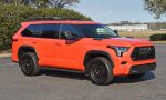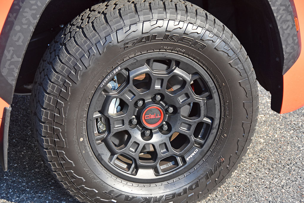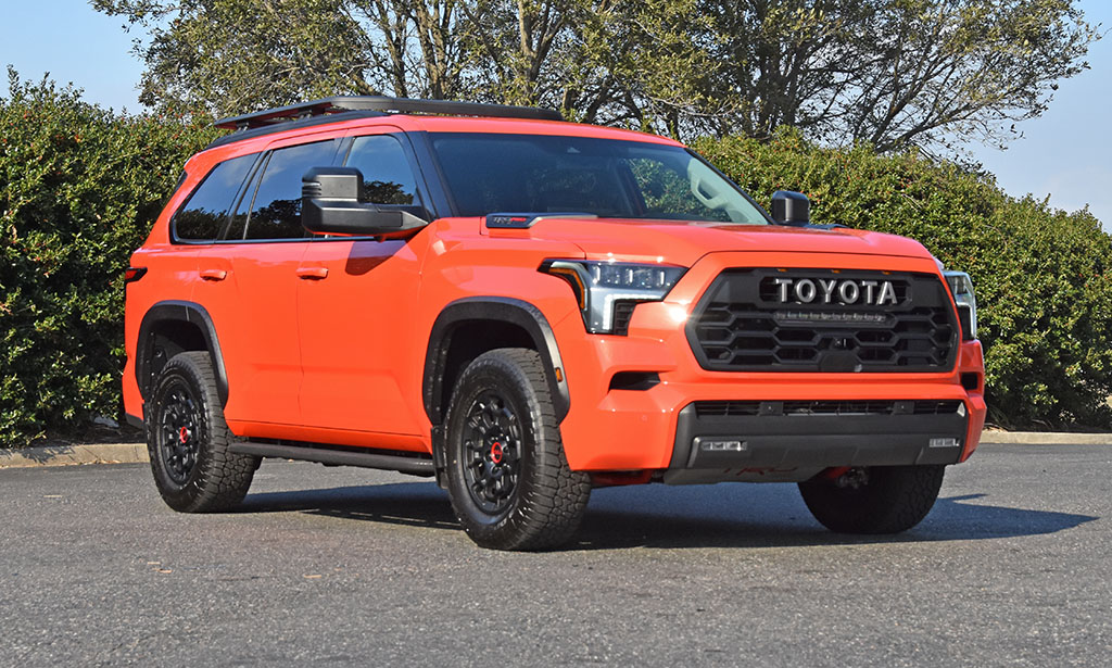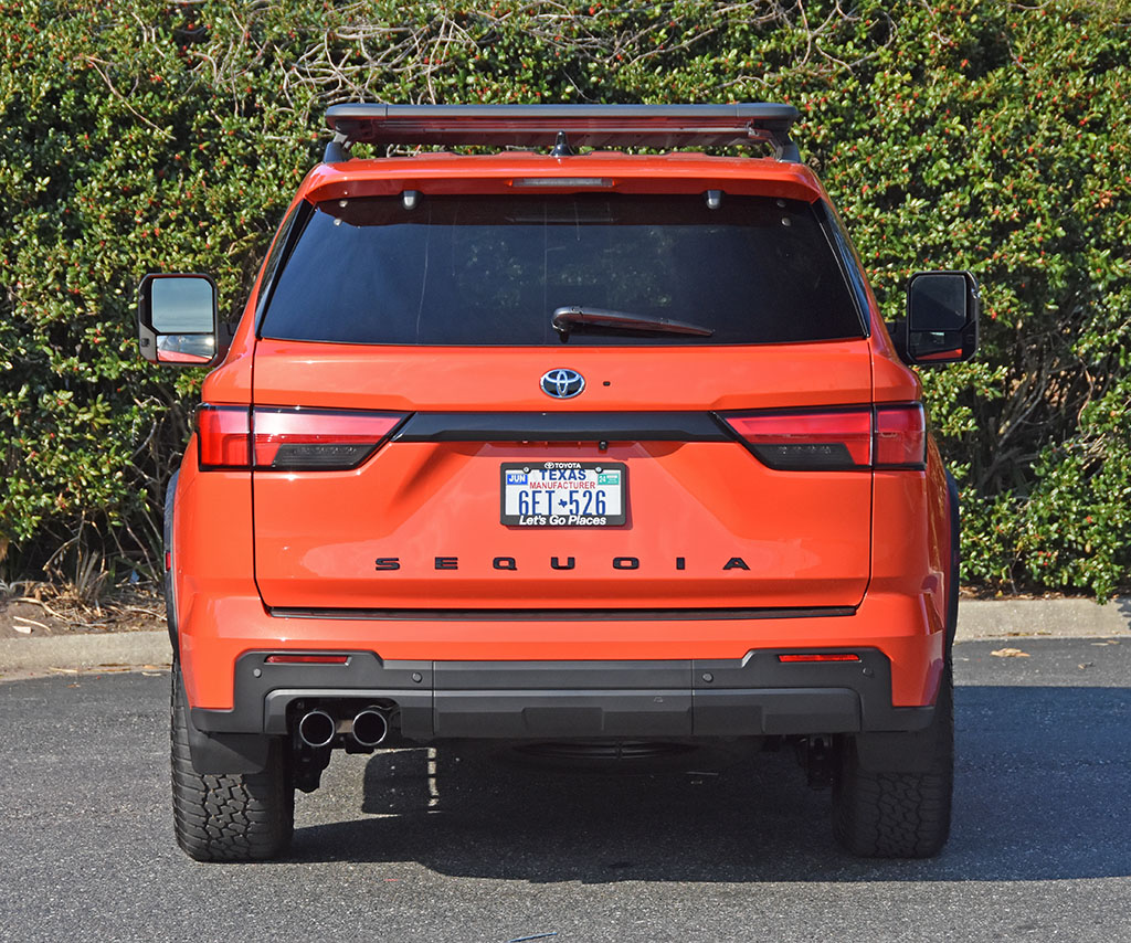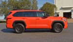 Toyota has changed things up in their SUV line where the Land Cruise can no longer be had in the USA. Instead, the new Sequoia partly fills that gap with several trim levels, including the Sequoia TRD Pro that I experienced this week. The new style of the Toyota Sequoia mostly mimics the new Tundra, which isn’t necessarily a bad thing. However, the style may be somewhat of an acquired taste for some depending on the trim level, where there are unique grille designs that can make or break the Sequoia in the looks department depending on your reception for large SUVs. The TRD Pro takes on a unique look with camo-styled darkened fender flares, BBS forged TRD 18-inch wheels wrapped by 33-inch Falken Wildpeak all-terrain tires, a wind-noise-inducing roof platform rack, a large underbody front TRD skid plate, and the availability of this eye-popping Solar Octane exterior paint color on my test vehicle.