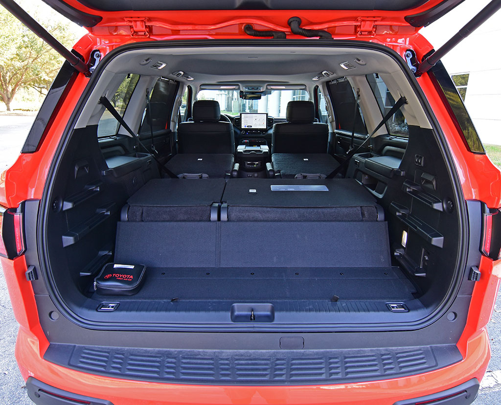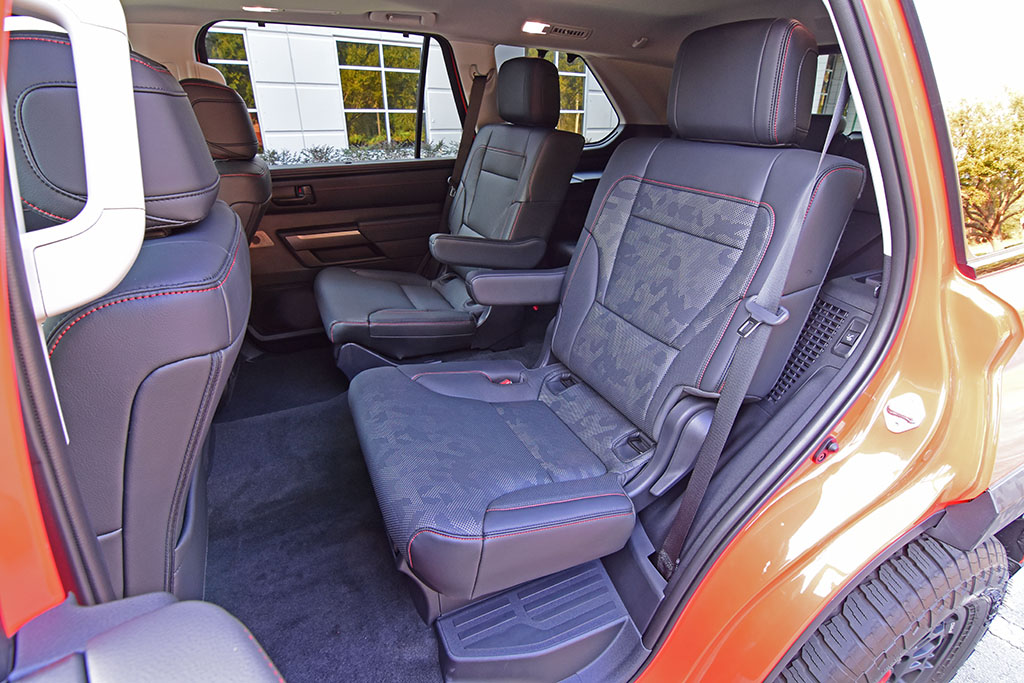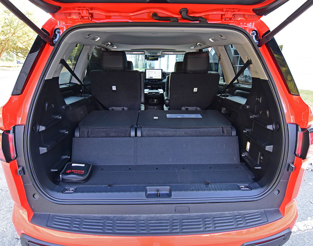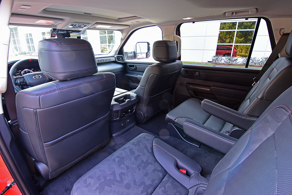 There’s a decent amount of hard plastic throughout the interior, but that rests with the Sequoia retaining its rugged approach, which replicates what you find in similar new Tundra trims. The Sequoia TRD Pro trim, just like in the new Tundra TRD Pro, has unique camo-styled seats with heating and ventilation up front. The second-row captain’s chairs are comfy but lack heating or ventilation, which is found only in the Sequoia Platinum or Capstone trims. The third-row seats, with legitimate room for three passengers, are easily accessed through the second-row seats performing a pneumatic two-step folding action. The only downfall I find out back is the third row has limited headroom and proves to be in a strange positioning, which does not fold completely flat for extra cargo room.