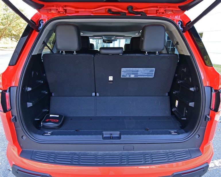 Cargo space is mostly what you expect in such a large SUV, but not allowing the third row to fold flat takes up a bit of space. Leaving the seats in place you have just over 22 cubic feet of space, folding the third and second row you have almost 87 cubic feet of storage to work with accessed by the hands-free power liftgate.