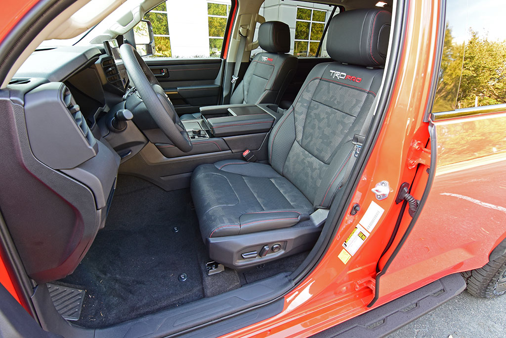 Towing is still a thing in the Sequoia TRD Pro, where you can tow up to 9,020 pounds, which is only 500 pounds less than a 2WD-only non-TRD Pro model. The large side review mirrors can be power-extended for better rearward visibility when towing. However, the mirrors, even in their normal position, take a while to get used to as they block some of your side views. Use of the Multi-Terrain Select traction modes and crawl control enable the Sequoia TRD Pro to master challenging terrain coupled with the unique suspension setup and all-terrain tires. I see the new Sequoia having no issues competing well with its competition from many newcomers to the off-roading large SUV scene.