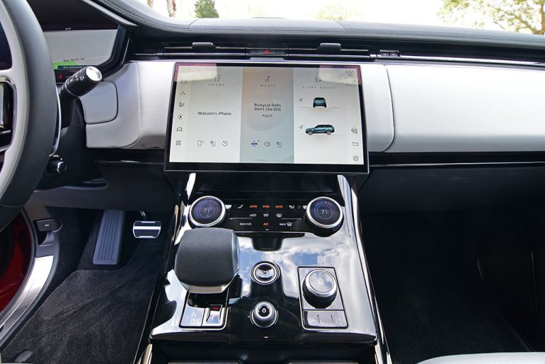Customary to what you expect in a new Land Rover, the new Range Rover Sport First Edition captivates with its interior having several leather or alternative-leather upholstered surfaces coupled with unique trim and expected soft-touch areas throughout the cabin. The only hard plastics are found in small trim areas and the piano black center console surrounding the padded gear shifter and select climate control knobs and haptic buttons. The overall new layout of the interior is welcomed with the large 13.1-inch curved infotainment touchscreen that waterfalls on a hidden mount on top of the dashboard. The screen and system have an abundance of feature sets along with the many vehicle settings with some redundancy when coupled with the haptic climate controls below and terrain response setting knob. The touchscreen, with its optional-setting haptic feedback feature, is mostly responsive after an initial load time but has sizable learning curve for most. I do enjoy the customization options of the system allowing you to drag feature icons for quick access along with modifying the home screen setup with its many core functions and vehicle feature settings.