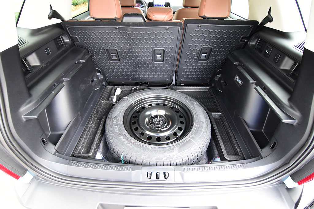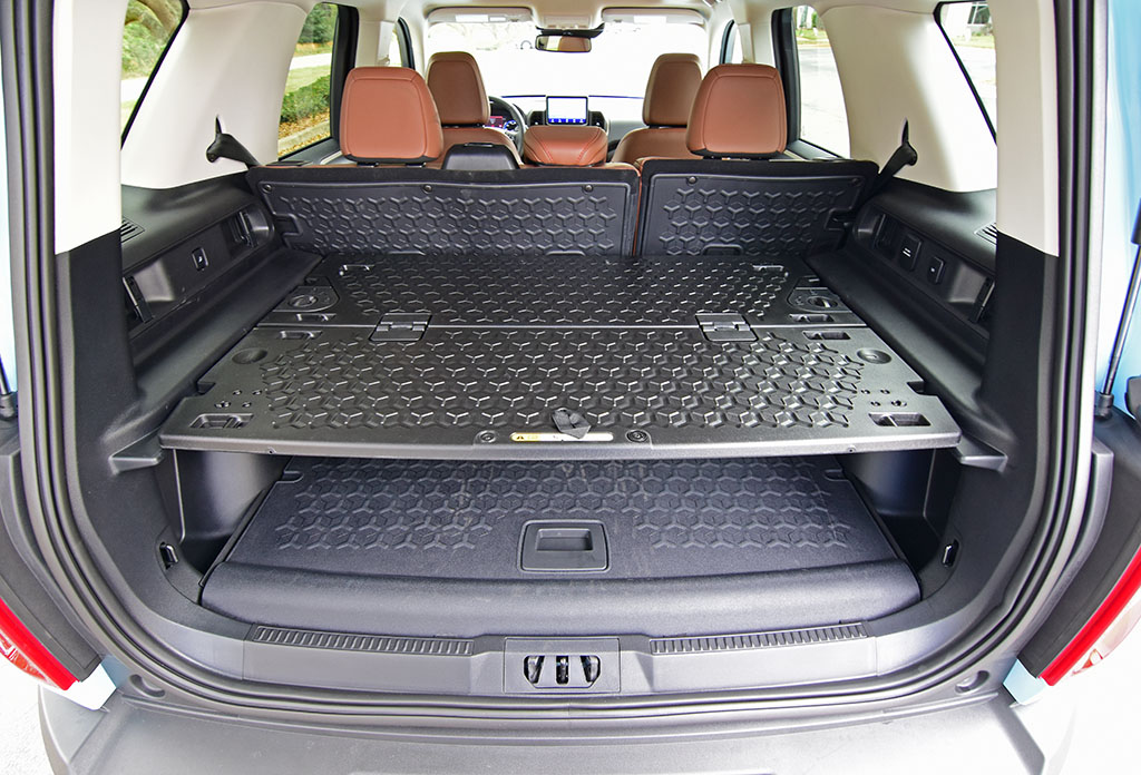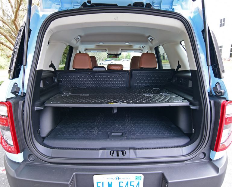 The cargo area of the Bronco Sport is very practical and accommodating, having Molle straps and an optional cargo management system shelf/table. There’s just over 32 cubic feet of usable space with the rear 60/40-split seatbacks in place. Fold them down and you have just over 65 cubic feet of storage.
