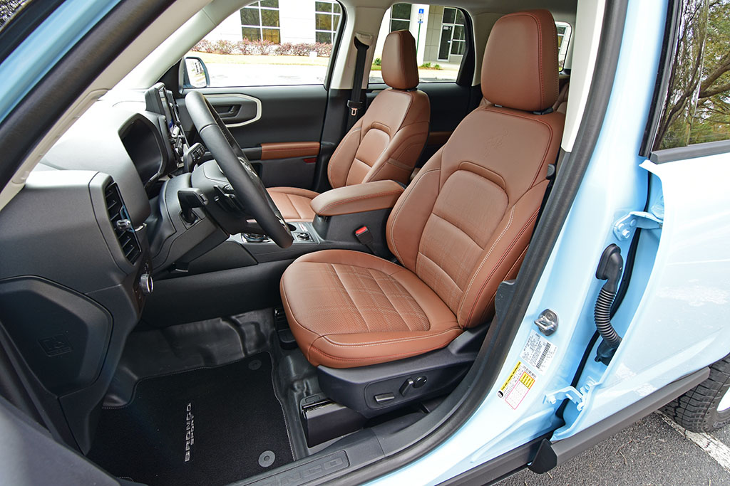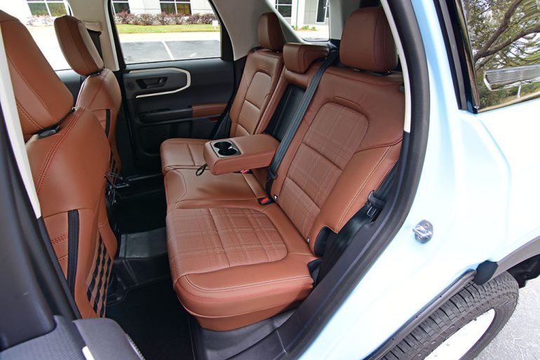 Inside the new Ford Bronco Sport is somewhat of a unique space that retains much of what is liked about the smaller Bronco Sport having a versatile and accommodating cabin. While the Bronco Sport’s interior is on the smaller size, Ford makes wise use of the proportions, with the one unfortunate stand-out exception being the rear seat legroom. Rear legroom is disappointingly short, and having taller front passengers adjusting the front power seats back only makes things worse, hardly leaving enough room for even small children.
