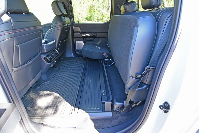 Just like you find in a new loaded-up top-trim F-150, the Raptor R has an inviting cabin that’s somewhat unique, starting with the sporty but extremely comfy seats with heating and ventilation up front. The back seats are very comfy as well, with heating on the outboard seats and enough room to feel like you’re at home on the couch watching TV. While there’s no TV in the Raptor R, there is a quiet large 12-inch infotainment touchscreen up front running Sync 4 with wireless or USB-connected Apple CarPlay and Android Auto. The latest Sync system from Ford is good, and I didn’t find any fault with the operation as it was always responsive and mostly user-friendly after a very short learning curve.