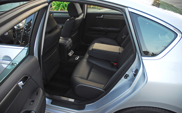 Inside, the intuitive design engages all of your senses in invigorating ways, combining a driver-oriented cockpit with a graceful, Infiniti level of luxury and design detail. You are surrounded with the finest leathers, aluminum and chrome trim pieces, chrome rings surrounding the door pulls and steering wheel spokes, aluminum plates on the dashboard and doors for the Sport model and dark African Rosewood for the regular M45 models. Visibility all around is excellent and the ‘Fine Vision’ electroluminescent gauges feature ‘gear-like’ rings around the 160mph speedometer and 8,000rpm tachometer for a mechanical look. Other interior highlights include the easy to use and understand unique center stack that flows into the center console with an aluminum shift gate housing a stubby, soft leather stick that feels great when operating.