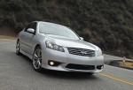 Joined up to a electronically-controlled vehicle-speed-sensing variable-assist power rack & pinion steering system with a performance gear, you quickly, precisely and effortlessly steer deep into corners aided with the Infiniti Rear Active Steer system, which uses precise, electronic motor-driven controls to turn the rear wheels. It is the only one available on a luxury sport sedan. The system helps improve the M45S’s handling performance by adjusting the geometry of the rear suspension according to steering input and vehicle speed. The system’s electronic control unit calculates the desired vehicle dynamics from a series of sensors, including vehicle speed and steering angle, and directs the system actuator to change the rear geometry by moving both rear suspension lower links. The result is a nimble steering response combined with luxury sedan stability and ride quality. You can feel not only the front end ‘bite’ when turning in, but also the rear gives the same feeling in steep curves at high speeds. I could shake the rear loose in even hairpin curves or corkscrew curves during my road test. It is really like driving on rails at high speed and when dicing through the curves. Amazing technology and its only available in the M Sport models. Standard vehicle dynamic control with traction control automatically adjusts brake pressure and engine torque during certain situations where the car is at its handling limit, helping you keep on your intended path. You can shut both systems off the let the rear end shake a bit when dicing through curves at high speed.