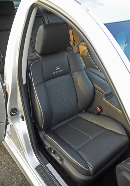 Also feeling perfect in your hands is the power tilting/telescoping, leather-wrapped sporty steering wheel. Dual cupholders follow into the center armrest with dual-adjustable armrests, dual level storage and a 12-volt power outlet. The 12-power adjustable front bucket seats are comfortable and supportive. The Sport model receives extra side bolstering to keep you firmly in place during high-speed cornering that comes naturally to the M45S. Standard interior features also include cruise control with steering wheel switches, dual zone automatic climate control with micro filter and rear air vents and for the first time a front passenger seat control to direct air for your feet, your chest or both, just like the mode switch for the driver-side. A 7in. color LCD screen gives vehicle information/driver information readouts, grab handles above each door, Infiniti analog clock, one-touch auto-up/down windows, front seat entry/exit assist with cancellation capability, remote trunk release, rain-sensing windshield wipers, power door locks, remote keyless entry, illuminated entry/exit, locking glovebox, dual illuminated vanity mirrors, front door map pockets, dual map lamps, outside temperature readout, self-dimming reaview mirror, heated/remote control side mirrors, green-tinted windshield, chrome-grip pull-out door handles, two driver memory for the front seat, outside mirrors, steering column and radio station presets, sunglass holder, rear armrest with dual cupholders and storage, fully carpeted trunk with cargo net, thick cut-pile carpeting with front/rear floor mats, rear window defroster/timer, power sliding sunroof, rear power sunshade, retained accessory power, Infiniti Intelligent Key with push button start/stop and Infiniti Voice Recognition System which controls audio, vehicle information system, climate control, optional navigation system and Bluetooth phone.