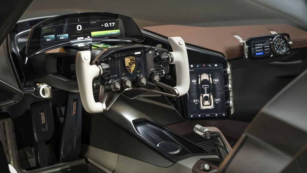 The interior of the Mission X exudes an undeniable sense of speed and performance, captivating onlookers. The carbon-backed seats, equipped with six-point harnesses, seamlessly integrate into the cabin. The driver’s seat distinguishes itself with a combination of Kalahari Gray and Andalusia Brown, while both seats exude an alluring aura. Positioned behind the steering yoke are four paddles whose specific functions are not yet disclosed, though regenerative braking appears to be a plausible guess. An ornate stopwatch, designed by Porsche Design, is located in front of the passenger and can be detached via a bayonet system on the instrument panel. This stopwatch can be utilized in conjunction with the built-in cameras for track purposes. Furthermore, there is speculation that this area could accommodate additional accessories, such as a screen, for non-track usage.