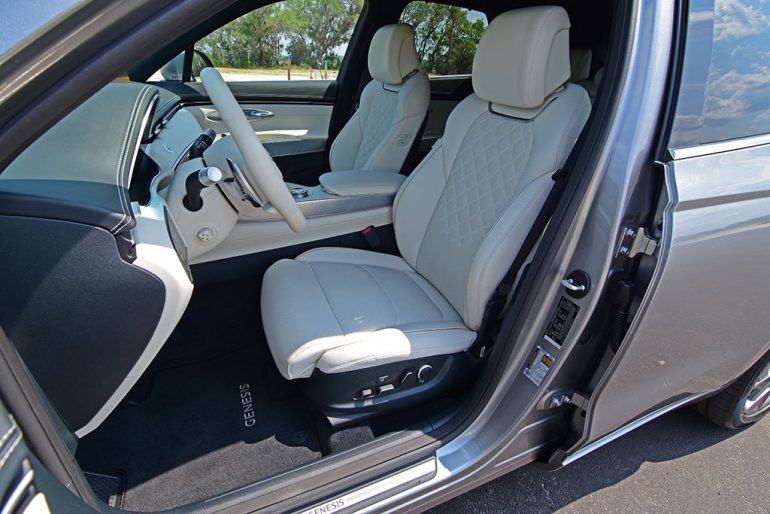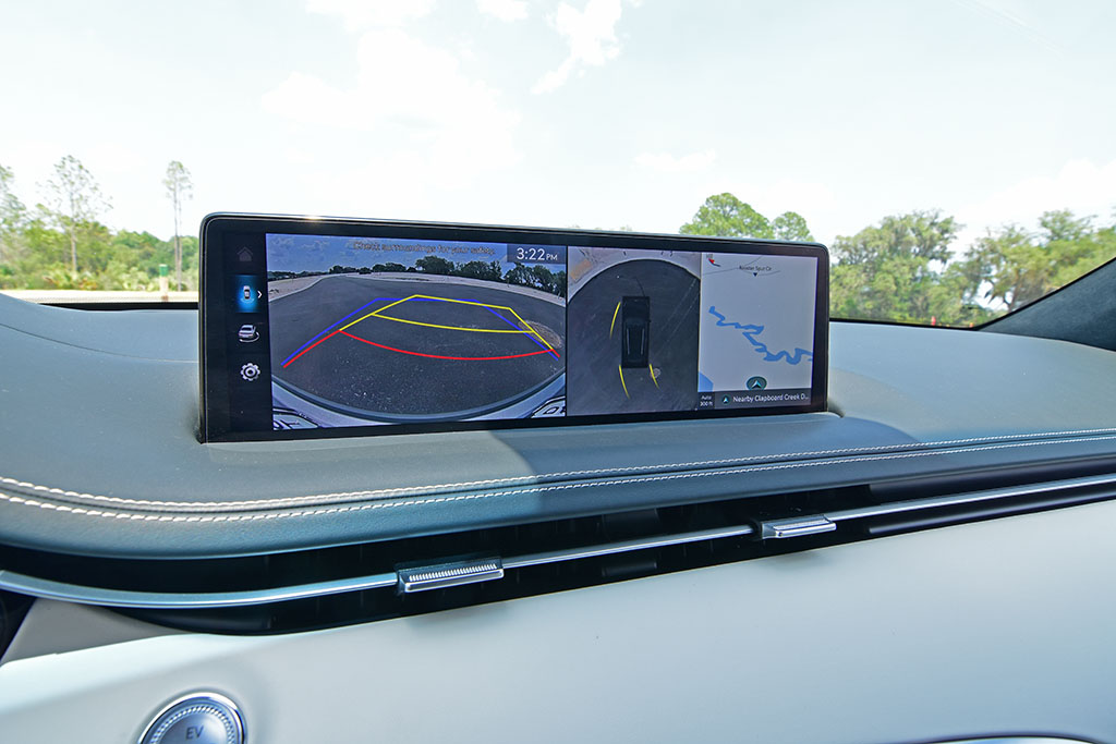 Genesis bundles up all the typical, expected active safety features and includes their latest Highway Driving Assist II system to maintain its lane at a set speed but doesn’t allow true hands-off capability. The 360-degree camera system combines a neat birds-eye view from multiple angles that can be dragged and viewed on the wide infotainment touchscreen.