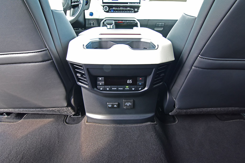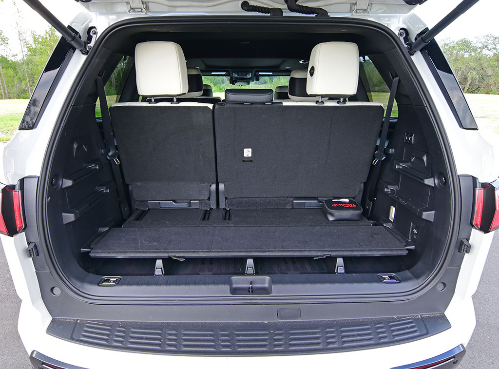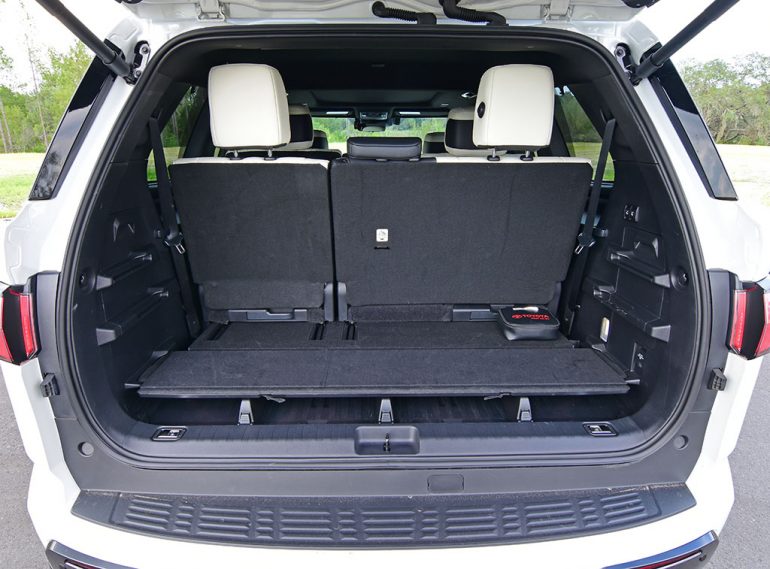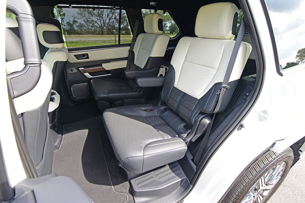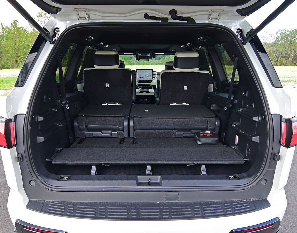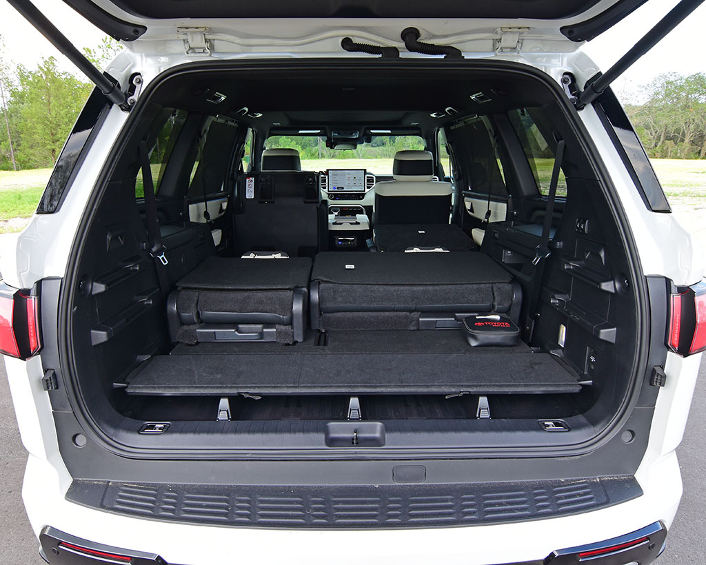Seating areas are huge and prove to be surprisingly comfy despite the initial look of the seat’s bubbly bolstering. The second-row captain’s chairs are comfy as well, while the third-row seating for three people is large and wide, but taller individuals over 6 feet may want to skip the row as the roof is not as high from the seat bottom as I would have thought. Also, the third-row seating can power-fold but not completely flat to the floor – the seats folded rise above the floor a few inches where you don’t have a flat loading floor in the Sequoia, even though you have just over 22 cubic feet of storage with the seats in place and nearly 87 cubic feet with both rear rows folded.
