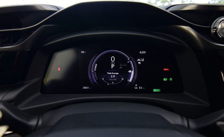 Upon first jumping in and driving the Lexus RZ 450e, I was pleased with how it felt like any other traditional gas vehicle, even though it is fully electric with a dual-motor setup for all-wheel-drive. The two-motor powertrain produces 308 horsepower and 320 lb-ft of torque. The power feels substantial and consistent until the battery starts to get below what I figure is around 40% or so, because there’s no battery state of charge percentage readout, only a mile range estimate and a battery meter in the digital gauge cluster.