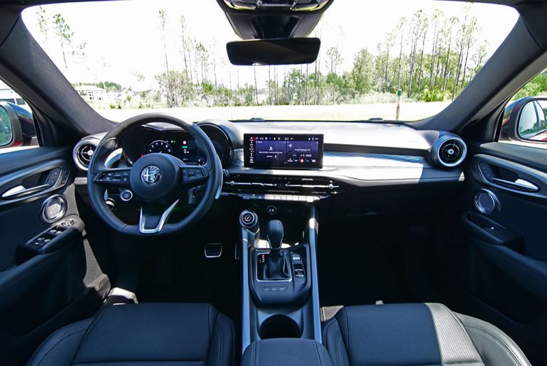 The infotainment system, using a 10.25-inch touchscreen, takes many elements from the Uconnect system under the Stellantis umbrella with a short learning curve and decent-enough response. The system is mostly straightforward, with its core functions listed in a row on the left side, but some vehicle and system settings may take a while to access. One interesting part is system is using the voice prompt by saying, “Hey Alfa,” I may have laughed a little in doing so to instruct the system to lower my climate temperature. The dual-zone automatic climate controls are simple physical buttons and a toggle button for temperature adjustments. I often found myself forgetting where the volume control is as it resides in the right corner area of the shifter housing as a knurled scroll wheel. There’s also wireless or USB-connected Apple CarPlay and Android Auto integration.