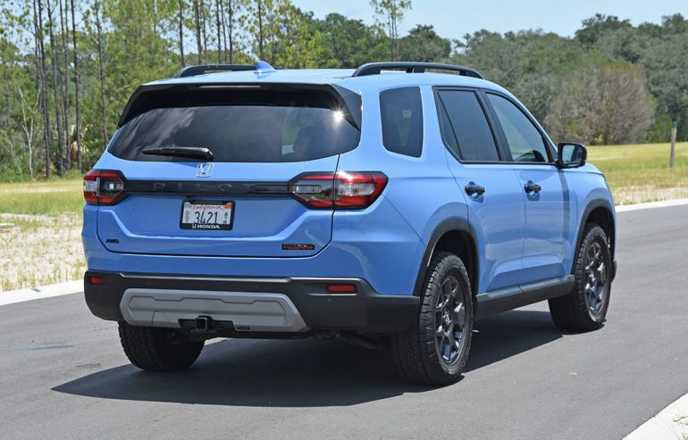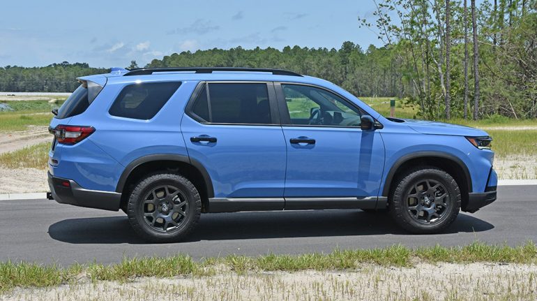 All new 2023 Honda Pilots are powered by a new 3.5-liter V6 engine producing 285 horsepower and 262 lb-ft of torque sending power to the front wheels or to all four through a new i-VTM4 all-wheel-drive system that’s optional in the LX, Sport, and EX-L trims but standard for the TrailSport, Touring, and Elite trims. Using a 10-speed automatic transmission, the Pilot has the advantage over some in making the best use of its V6 power, and in the TrailSport trim, the all-wheel-drive system has a unique trail torque logic control that can direct additional torque to the rear differential, and in those cases send up to 75% of available power to an individual wheel with the most traction. The system is interesting when it is enhanced in the Trail drive mode and detects when a wheel has left the surface and then sorts out power, which in some cases it may use brake vectoring to send more torque to a front wheel that has grip. The 20% more torque capacity is certainly a benefit for the TrailSport in conquering rough terrain over the other trim levels.