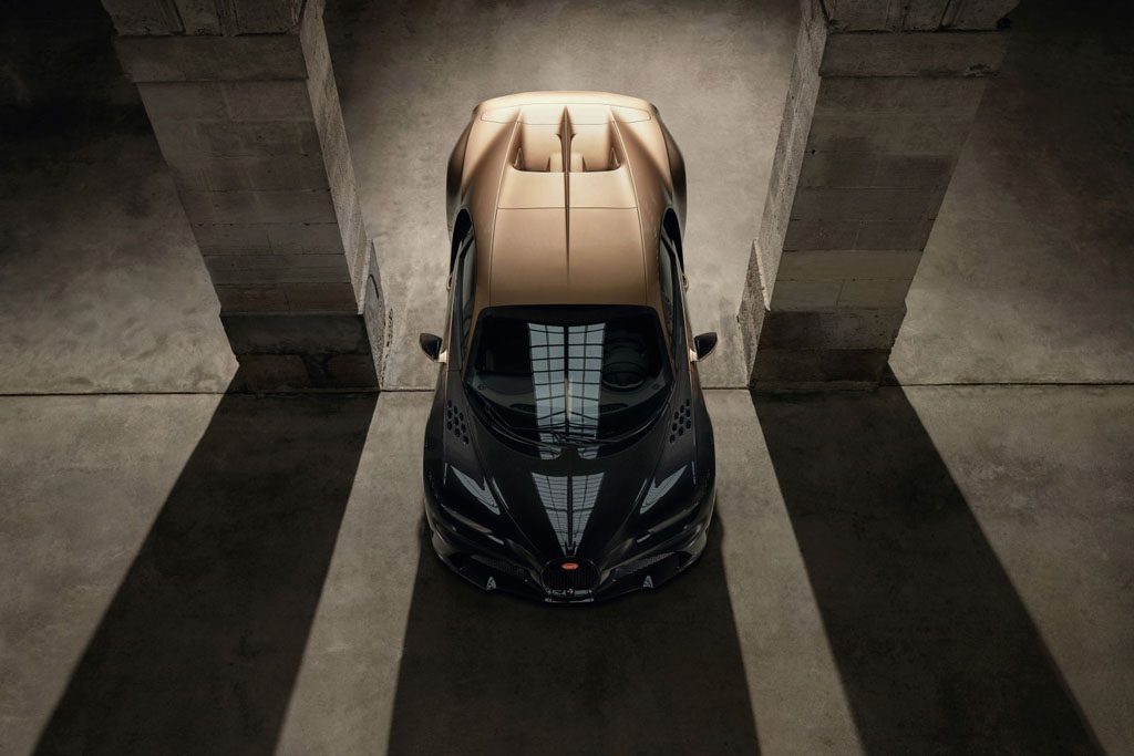 The very essence of this automotive masterpiece is embodied by its two-tone gradient paint scheme. Nocturne Black gracefully transitions into an exclusive Dore gold hue, a shade exclusively tailored for this automotive gem. This remarkable canvas of automotive artistry extends into the cabin, where each door panel is meticulously hand-painted with symbols representing Bugatti’s iconic models, both old and new. Subtle Golden Era stitching and a hand-written “One-of-One” insignia further underscore the exclusivity of this unparalleled creation.