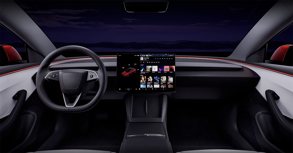 Inside the Model 3, the cabin has been revamped slightly for a lounge-like atmosphere. It features a wraparound design with an “enveloping architecture” incorporating aluminum and fabric materials. The entire cabin is bathed in ambient lighting, contributing to a soothing and modern interior ambiance. Tesla claims that the cabin is quieter thanks to the inclusion of acoustic glass and improved soundproofing materials.