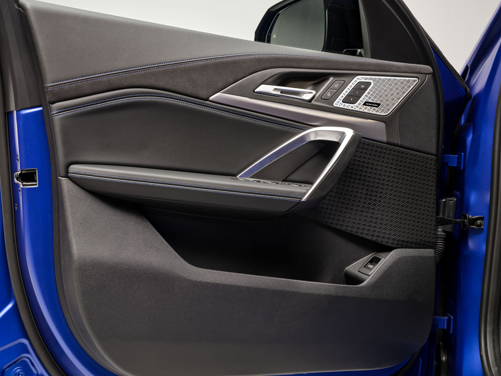 The seats within the X2 have been meticulously designed to provide support during spirited driving while ensuring long-distance comfort. These seats come standard in Veganza animal-free surfaces, available in Black, Mocha, or Oyster, with two-tone options like Red/Black or Atlas Grey/Smoke White. Even the M Sport package embraces the eco-friendly trend, combining Veganza with Alcantara sport seats in black with blue contrast stitching. Additionally, the option of a dark-tinted panoramic roof provides a sense of openness to the cabin.