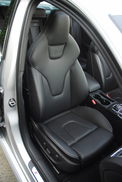 3-spoke tilt/telescoping steering wheel that feels great in your hands, a 3-zone climate control system, easy to use center stack with all buttons and dials within easy reach and fully illuminated, thick cut pile carpeting with floor mats, aluminum Audi S4 kick plates, Audi concert AM-FM radio with in-dash CD player (my tester came with the incredible 14-speaker Bang & Olufsen surround sound system), black, soft-to-the-touch dash with lots of aluminum trim and carbon atlas interior inlays on the center console, dashboard and doors, black matching headliner, center console padded armrest with storage bin, locking glove box, dual cupholders, 60/40 split folding rear seats with pull out center storage and dual cupholders, grab handles above each door, self-dimming rearview mirror, intermittent wipers/washers, all express up/down windows and central locking system, electric sunroof, adaptive cruise control, Homelink remote transmitter, Bluetooth hands-free phone interface, iPod integration, dual map lights and vanity mirrors with lamps. The interior has it all for a sporty yet luxury ride.