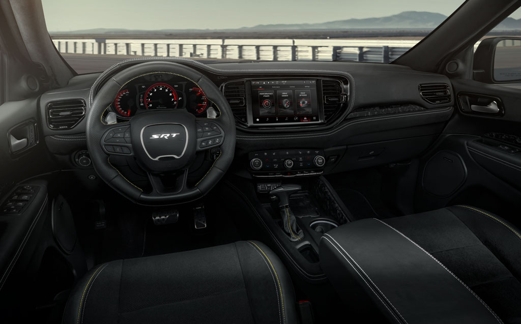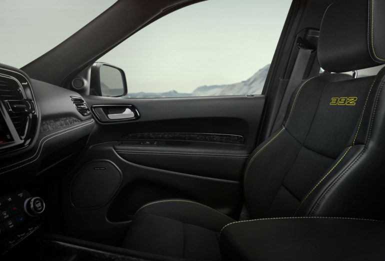 The exterior of the 392 AlcHEMI is distinguished by 20-inch Satin Black wheels, yellow brake calipers, 392 yellow-accented fender decals, honeycomb-textured stripes with yellow accents, black exhaust tips, and black metallic badging. Inside, the yellow theme continues with yellow and silver stitching, a “392” logo embroidered on the seats, forged carbon fiber trim, and a white LED SRT logo on the steering wheel.