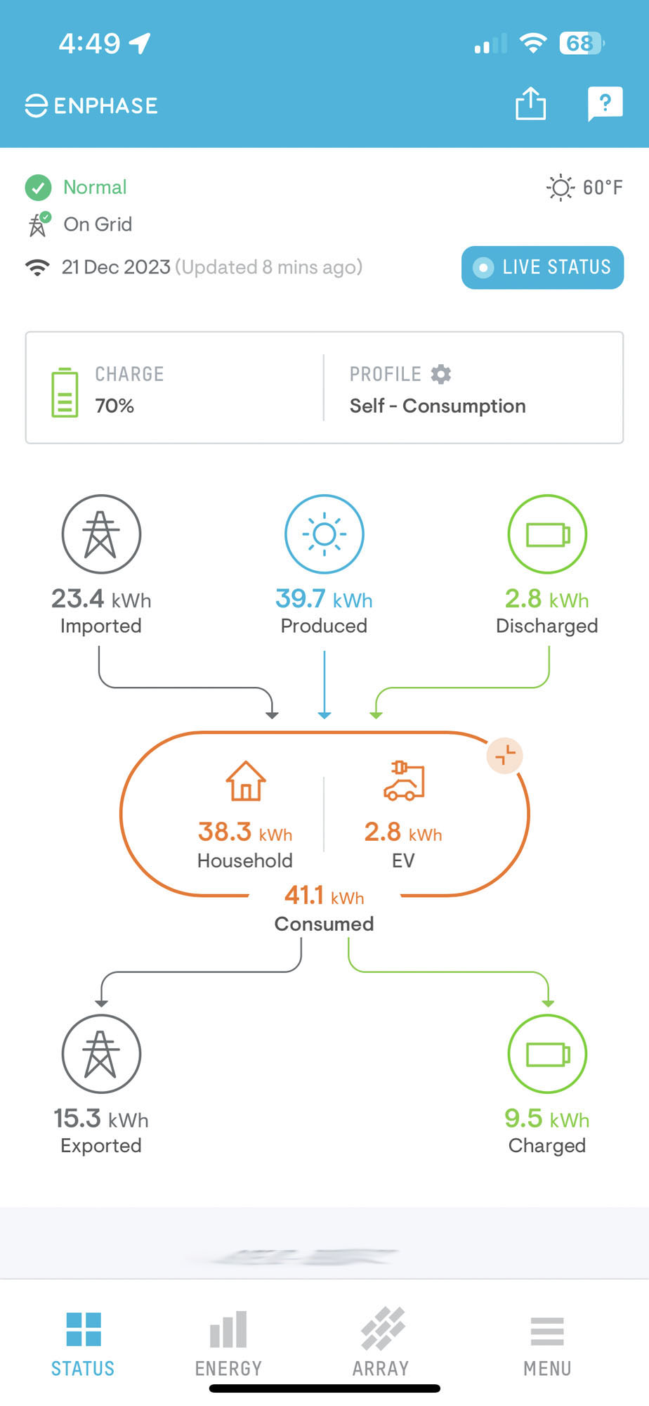 During charging sessions when the sun is out, the IQ EV charging unit will automatically utilize the power from your solar panels to charge an EV. When the sun is blocked by clouds or begins to set, providing you with less solar panel power, the output to the EV declines as well, which seems to be one of the pitfalls of such a setup when leaving it in its default setting. However, when switching the unit to charge utilizing grid power, the solar power is often prioritized to provide power, but the grid energy is automatically supplemented to offer a full-rate charge to the EV. Basically, if left to the default setting, the charger will not charge during the night. You will have to manually toggle to charge at night utilizing grid power, but you may do it under a set schedule to use off-peak energy and a potentially lower rate/cost. Surprisingly, the Enphase app is smart enough to display an alert asking if you wish to switch over to grid power to charge your EV upon detection of little to no solar panel power being generated.