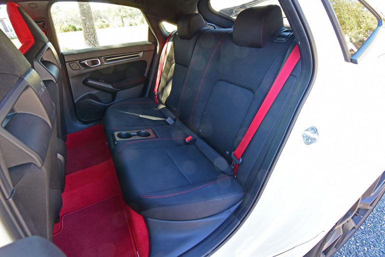 The interior of the new Honda Civic received plenty of praise from me in previous reviews of the new generation. For the Civic Type R, things are kept tidy, but the differences are the bright red carpets/floor mats, red accents, and the heavily bolstered front sports seats. Buyers of the Civic Type R must try out the front seats first to be sure that they feel comfy, as they are certainly not for everyone as they have aggressive bolstering. Such a trait is one big difference from the new Acura Integra Type S, with its seats being more forgiving for bigger folks, but the Civic Type R is much more aggressive and does not have a heating option like the Integra Type S.